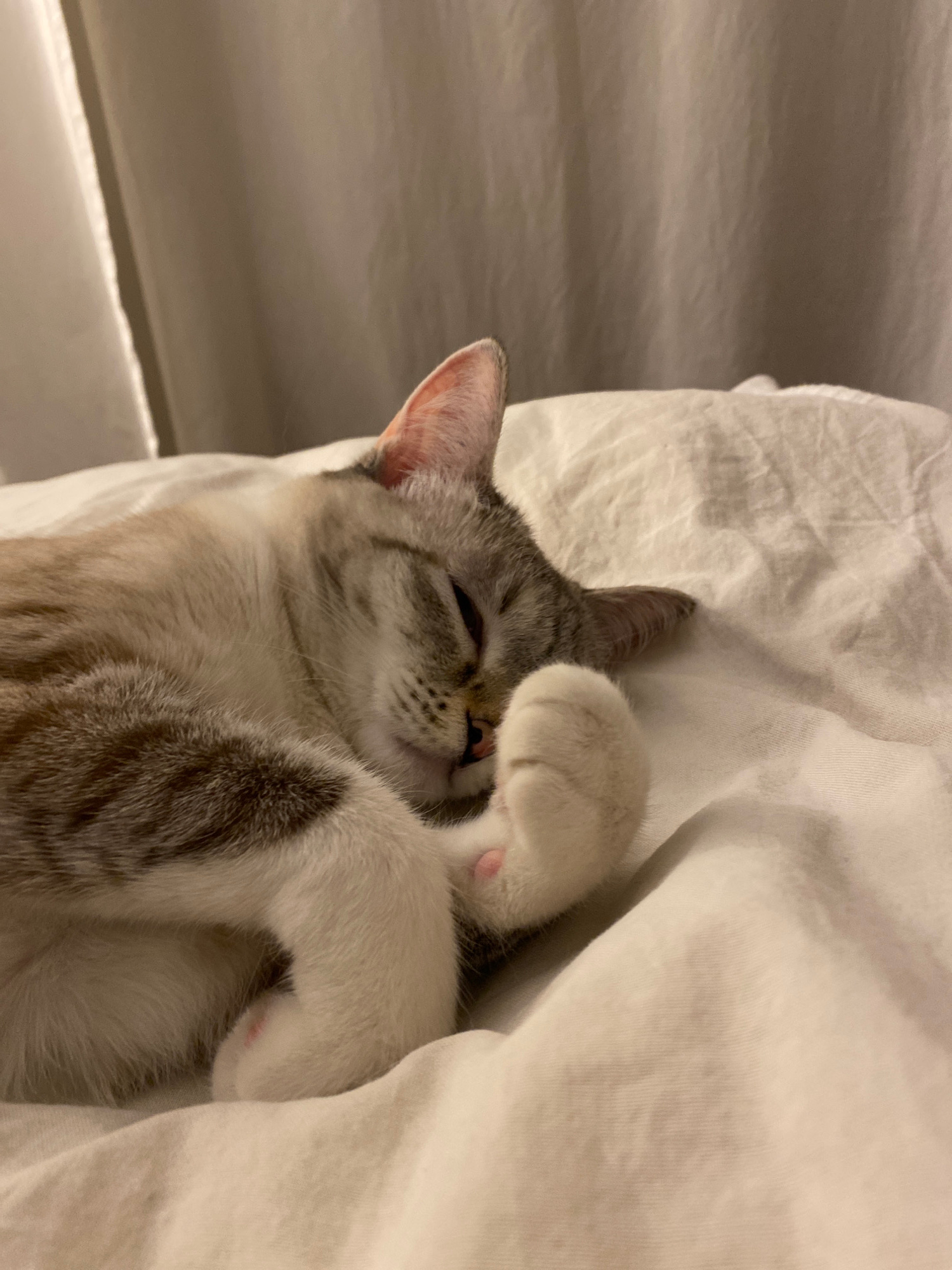 A cat with gray and white fur is lying on its back on a white sheet or blanket. The cat has white paws with pink paw pads. One paw is raised near its face. The location cannot be determined based on t…read more