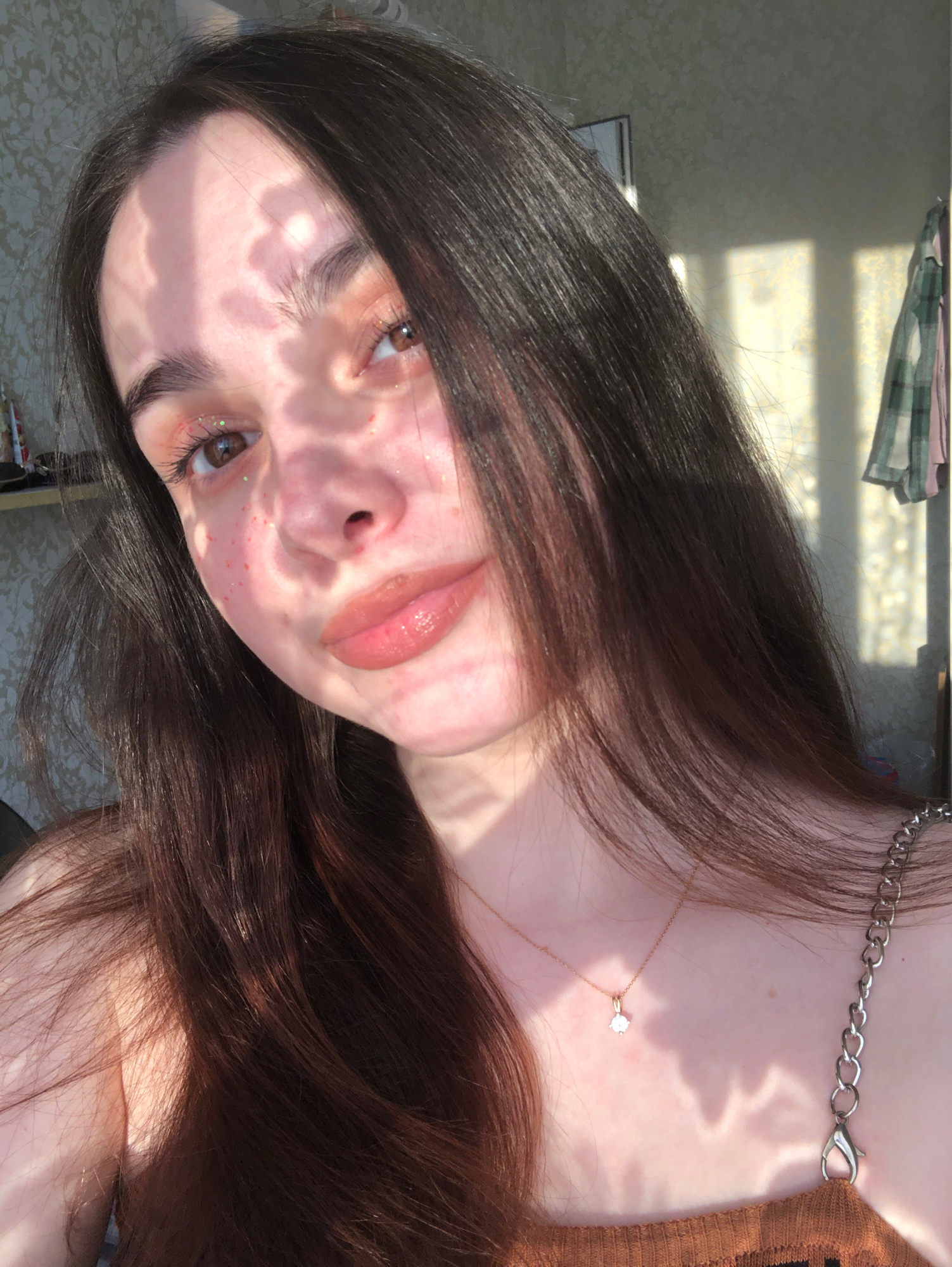 A young woman with long, dark brown hair is depicted in a close-up, tilted portrait. She is fair-skinned and wearing a brown top. She also has a silver chain around her neck and a delicate gold neckla…read more