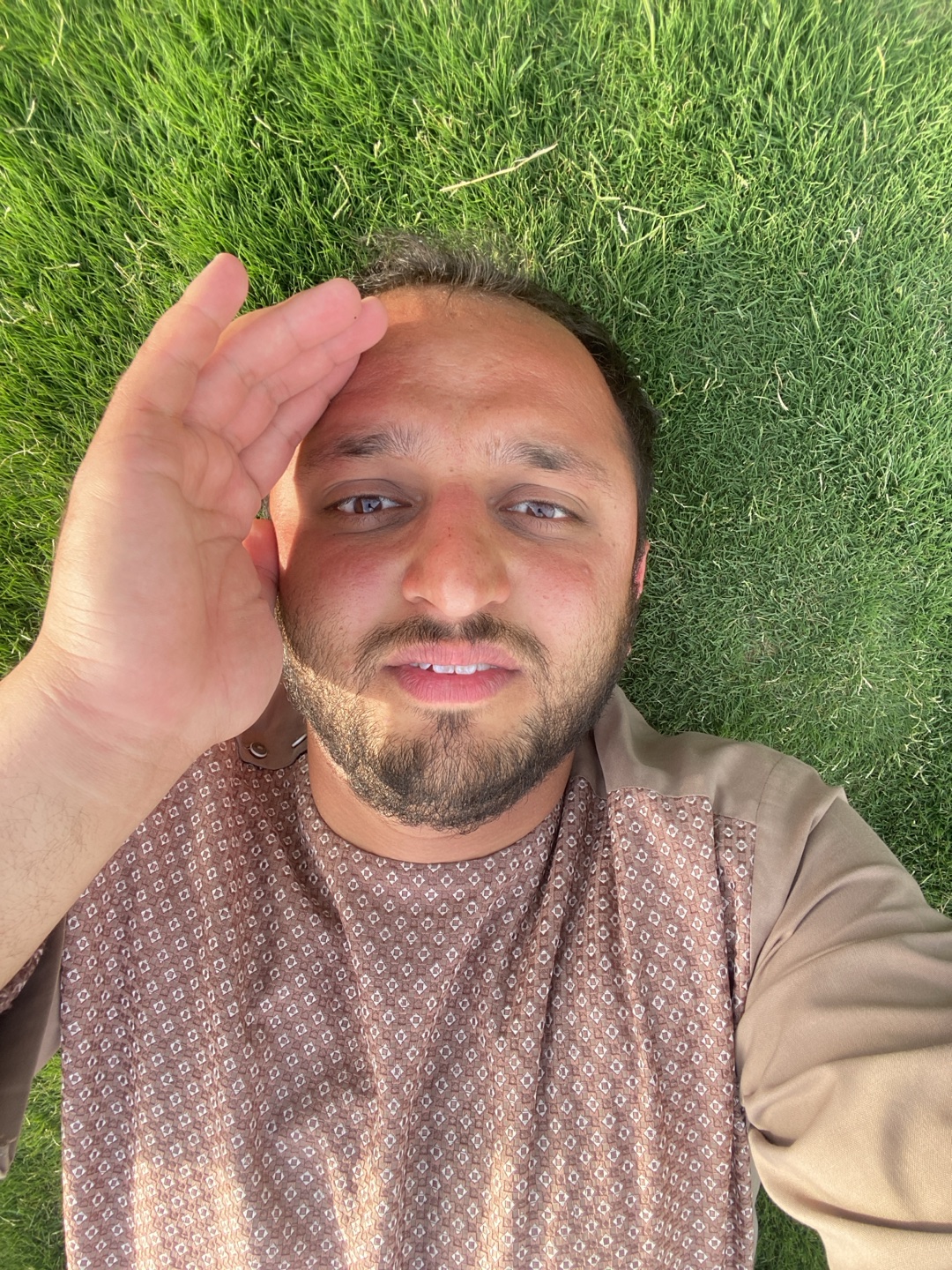 A man with brown skin, dark hair, and a dark, neatly trimmed beard and mustache is lying on his back on a vibrant green grass lawn. He is positioned centrally in the frame, looking directly upwards to…read more