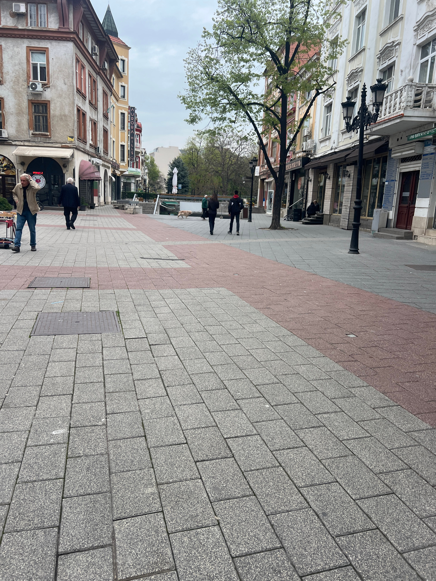 This image presents a vibrant urban street scene, likely a pedestrian promenade, in Plovdiv, Bulgaria, on an overcast day during spring or early summer. The street is paved with a distinctive pattern…read more