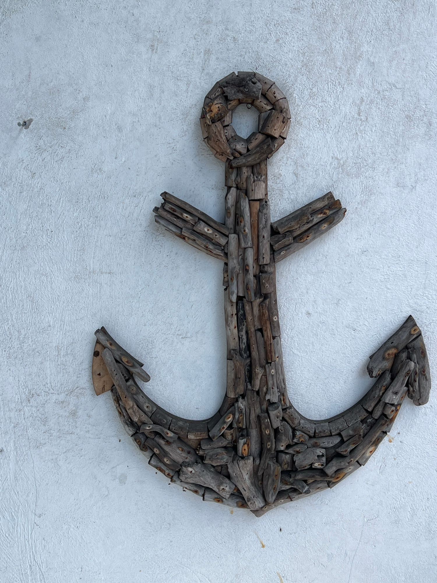 The image captures a large, decorative anchor art piece meticulously crafted from numerous small, weathered pieces of wood, prominently displayed against a textured white wall. The anchor’s traditiona…read more