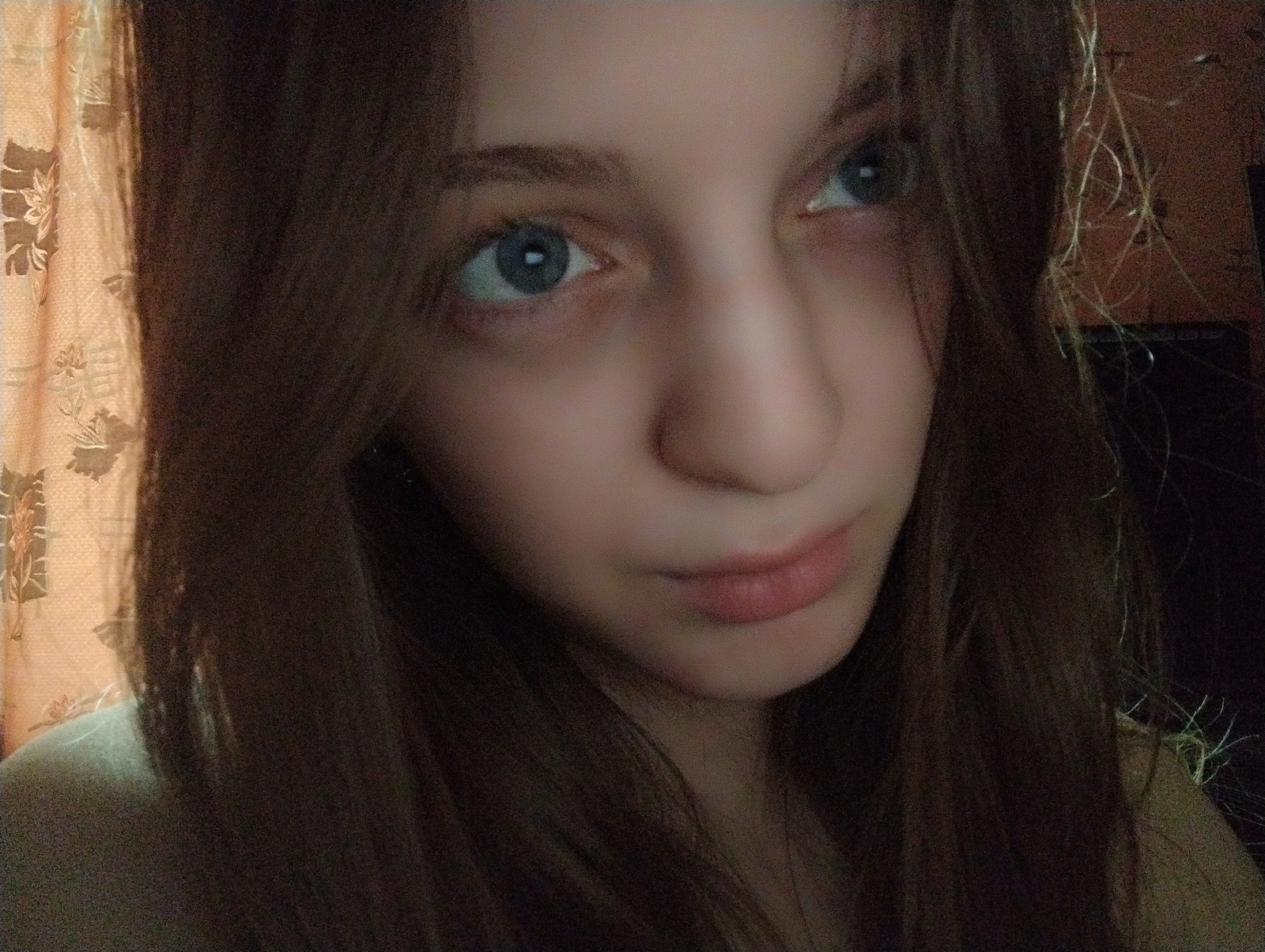 A young woman with fair skin and long brown hair is centered in the frame, looking slightly upwards and to the right. Her eyes are a light blue-gray color. Behind her to the left is a peach-colored cu…read more