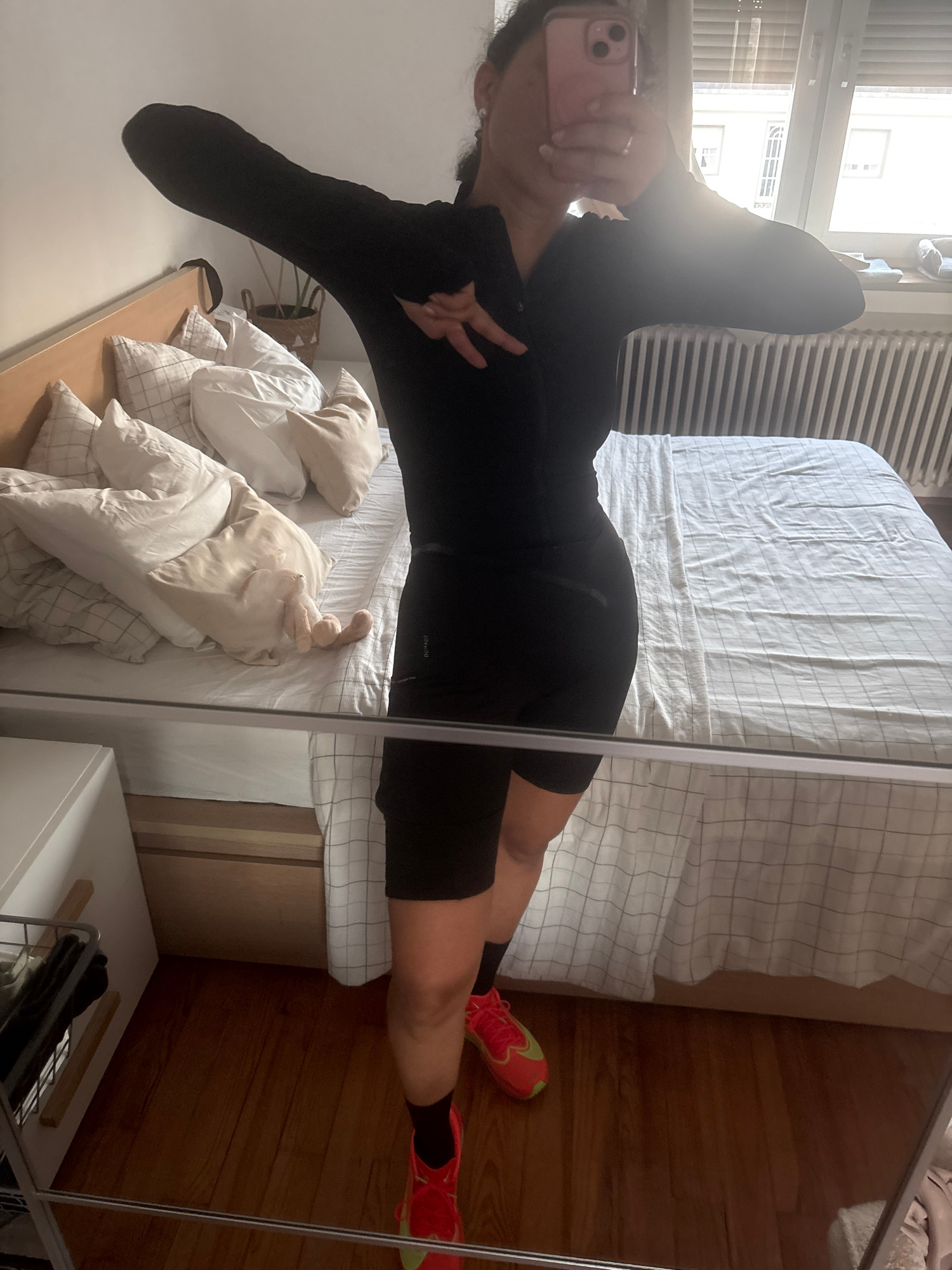 A full-body mirror selfie shows a person, likely female, standing in a bedroom. The person is wearing a fitted black long-sleeved top and black cycling shorts or athletic wear. They have dark hair and…read more