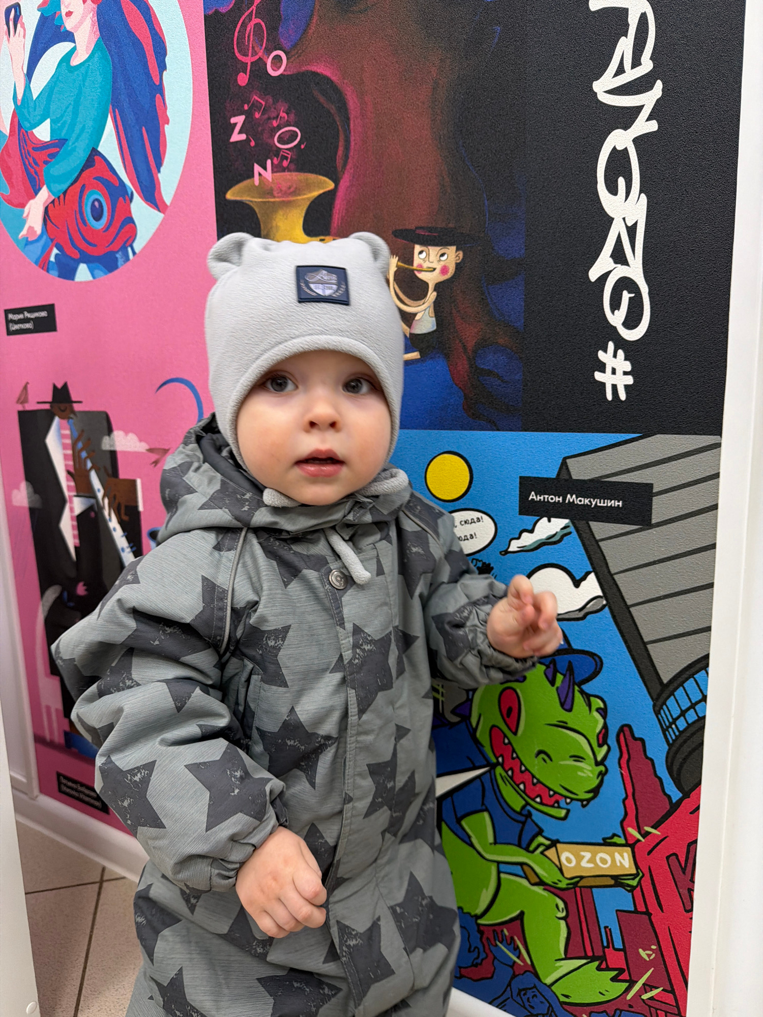 The media file features a baby, approximately 6-12 months old, dressed in a grey star-patterned snowsuit or jacket and a matching grey hat with ear-like details. The infant looks directly at the camer…read more