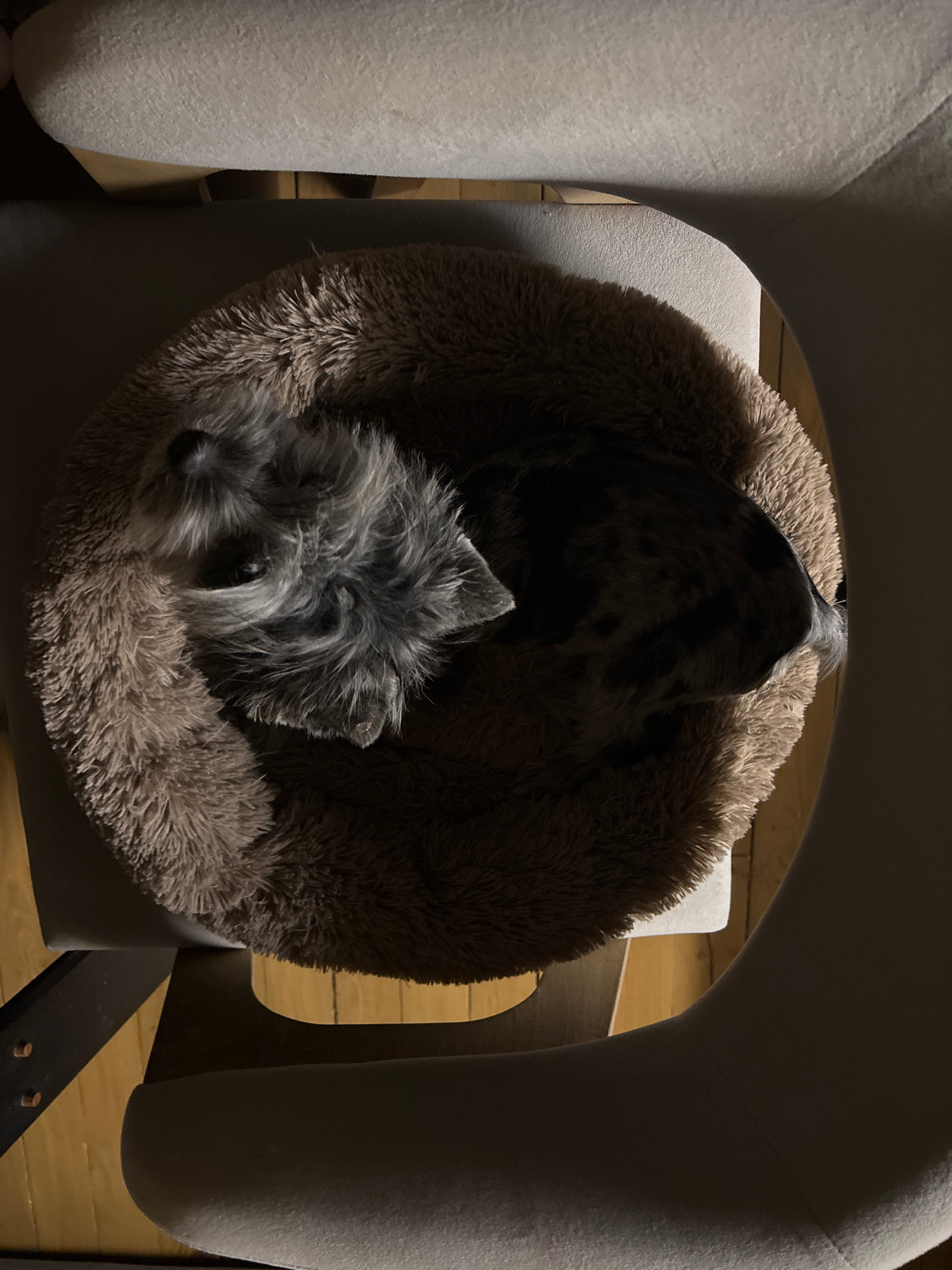 In Chaikovsky, Russia, a small, grey and black fluffy dog rests peacefully, curled up in a plush, round dog bed. The dog, likely a schnauzer or similar terrier breed, is mostly hidden by the high side…read more