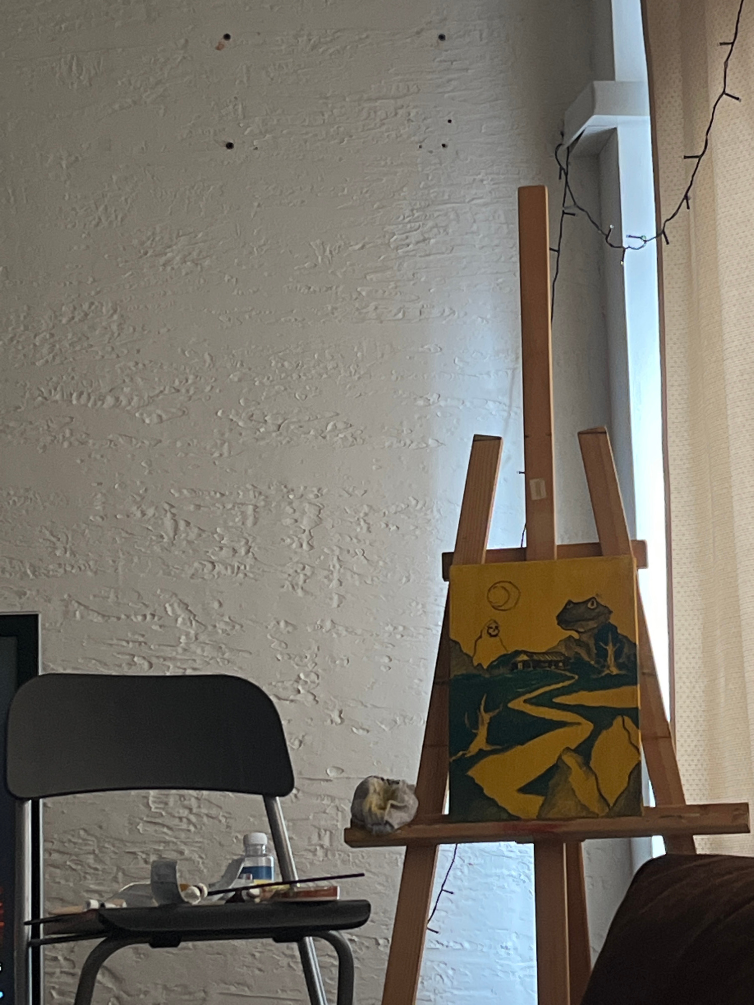 An indoor, medium shot captures a section of a room in Krasnoyarsk, Russia, featuring an eclectic arrangement of objects against a textured, light-colored wall. The upper left shows a portion of a lig…read more
