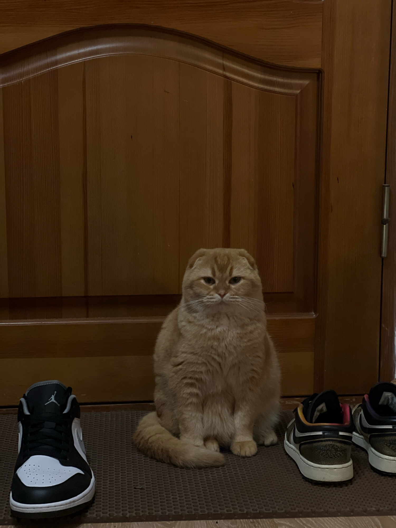 A medium shot depicts a Scottish Fold cat sitting on a doormat with two pairs of sneakers. The cat is orange-beige, facing the camera with a slight head tilt. The doormat is brown. One pair of sneaker…read more