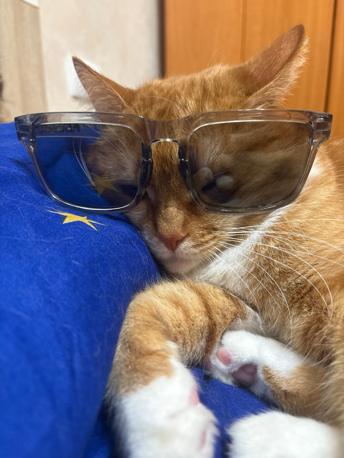 A forensic examination of the image reveals a recumbent ginger tabby domestic cat, positioned indoors in Bar, Montenegro. The cat's fur is predominantly orange with lighter stripes and white markings…read more