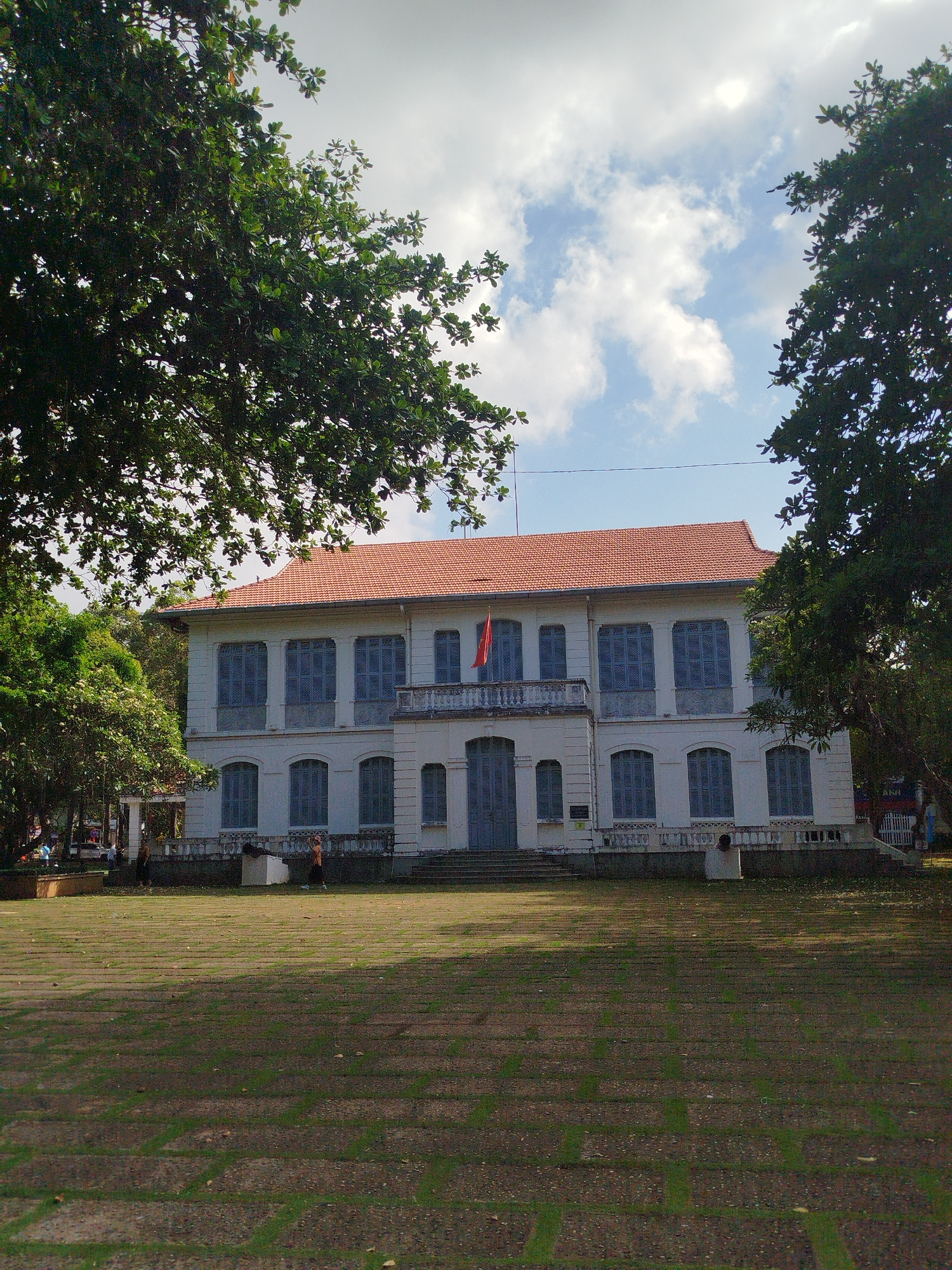 The image shows a two-story white building with a red tile roof in Ho Chi Minh City, Vietnam. Blue shutters cover the windows. A Vietnamese flag hangs from the second story balcony. Trees partially fr…read more