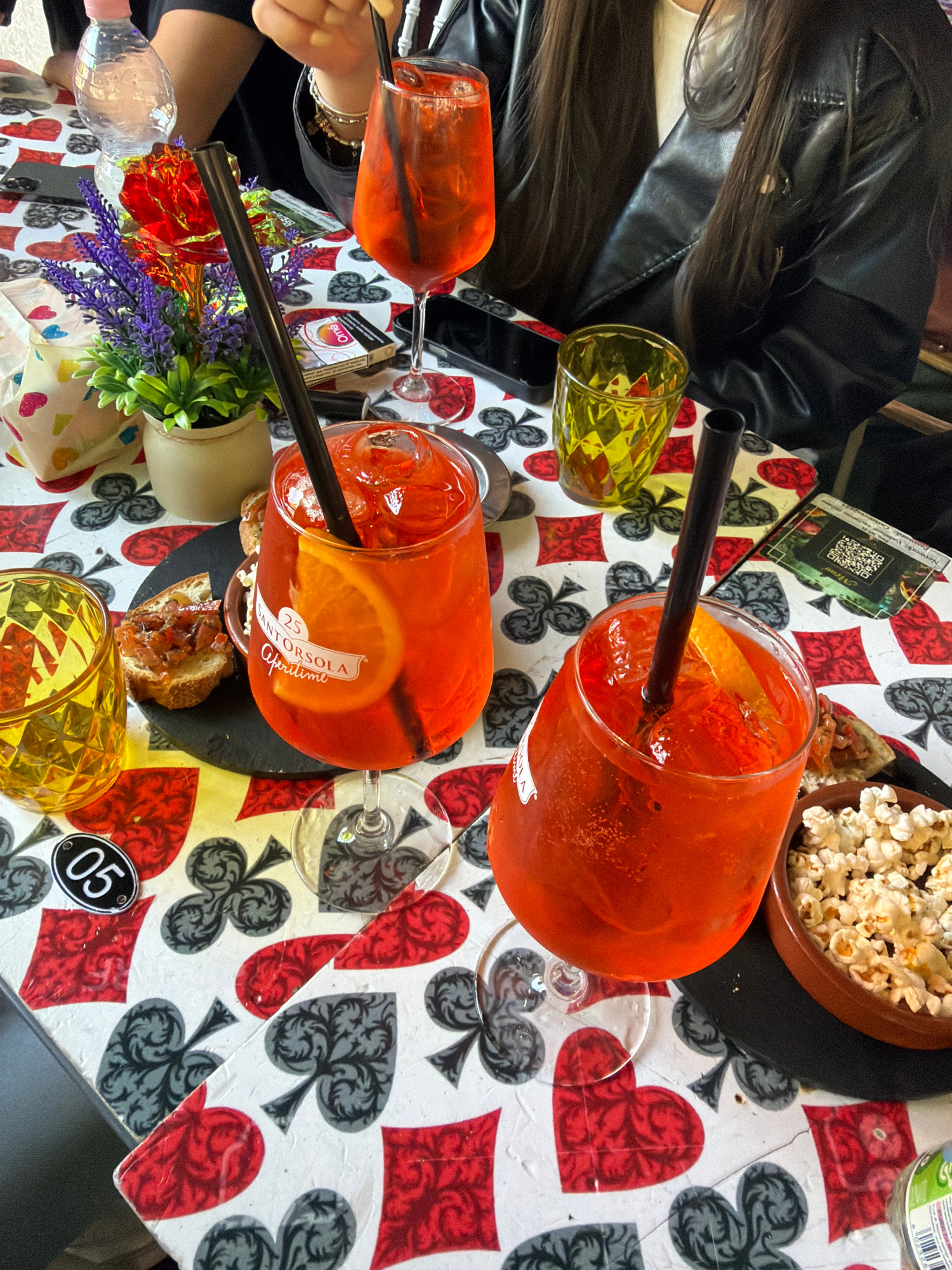 An overhead shot captures a lively table scene, likely in a bar or cafe in Milan. Two individuals are partially visible: one with long dark hair and a black leather jacket in the top left, and another…read more
