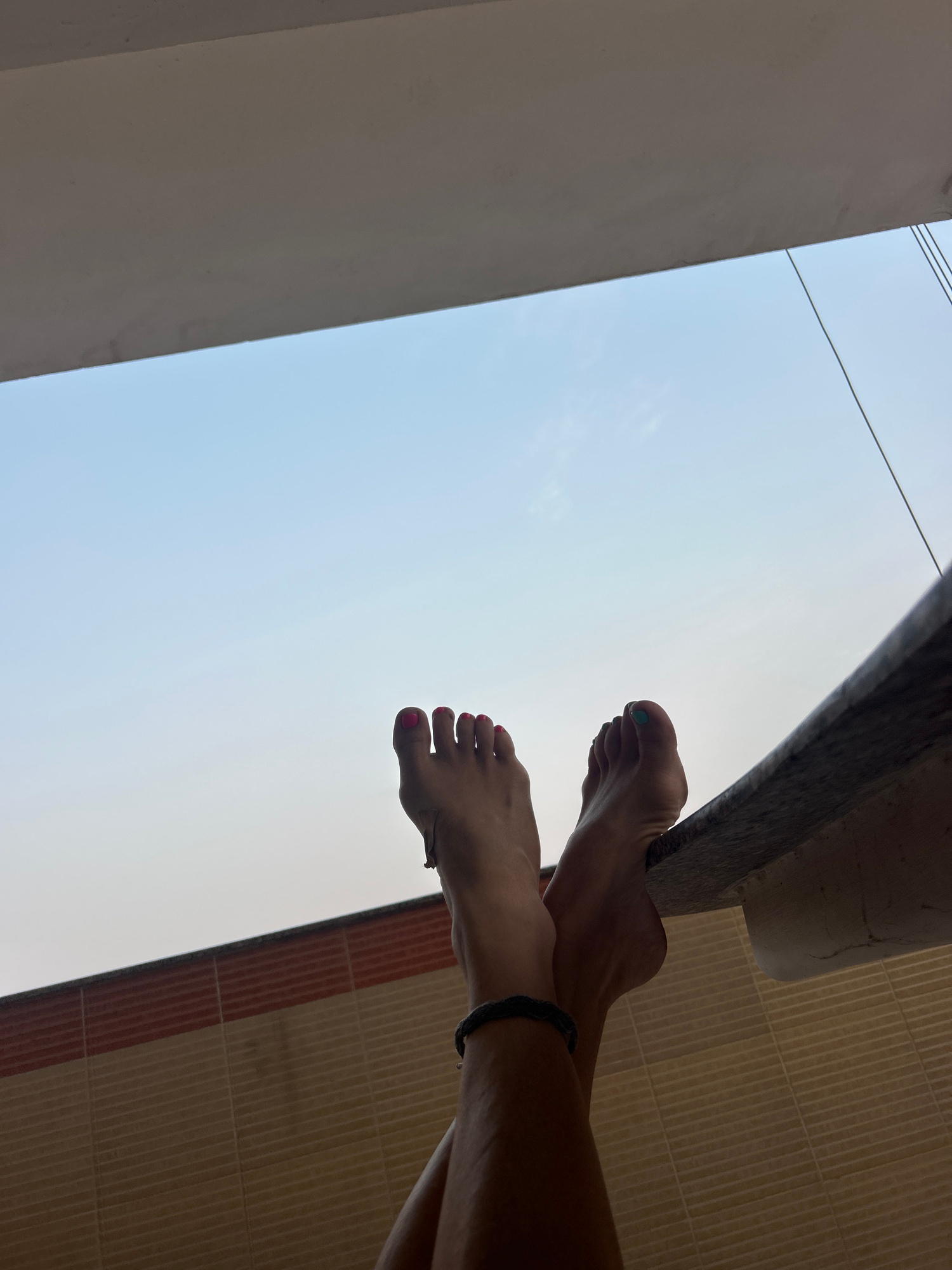 The image shows a low-angle view, seemingly taken from below. Two bare feet with painted toenails (one foot with pink polish, the other with light blue) are positioned in the upper right of the frame. The feet are near the edge of a structure, casting a shadow. The background is a pale, washed-out sky. Parts of building structures are visible on either side of the frame. The setting appears to be outdoor, but there are no indicators of a specific city or location like Puttaparthi, India. The scene seems peaceful and static. | Open Wire