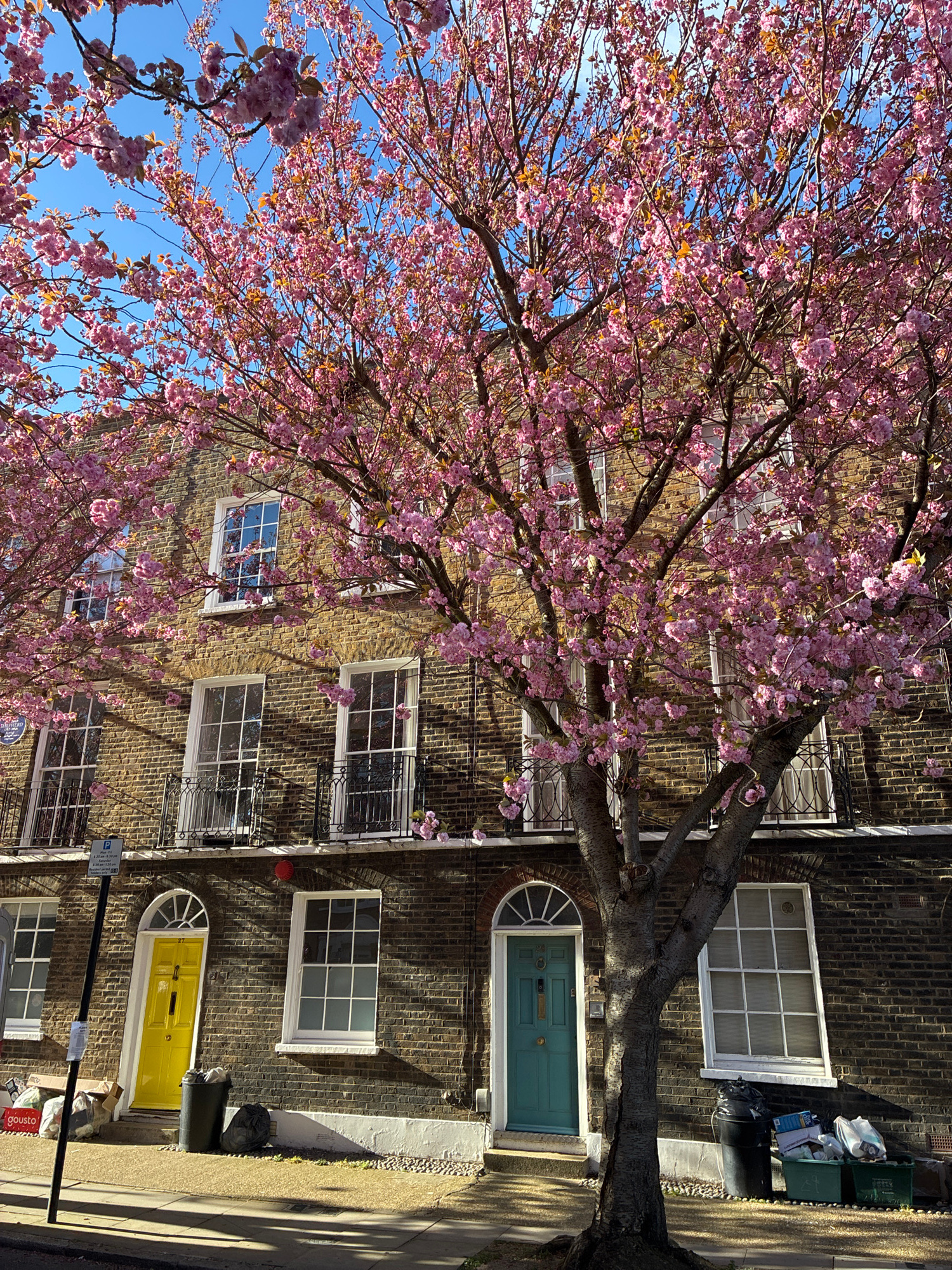A low-angle shot of a brick building behind a tree with vibrant pink flowers in full bloom under a bright blue sky, with a focus on the building's exterior details. The building features rows of white…read more