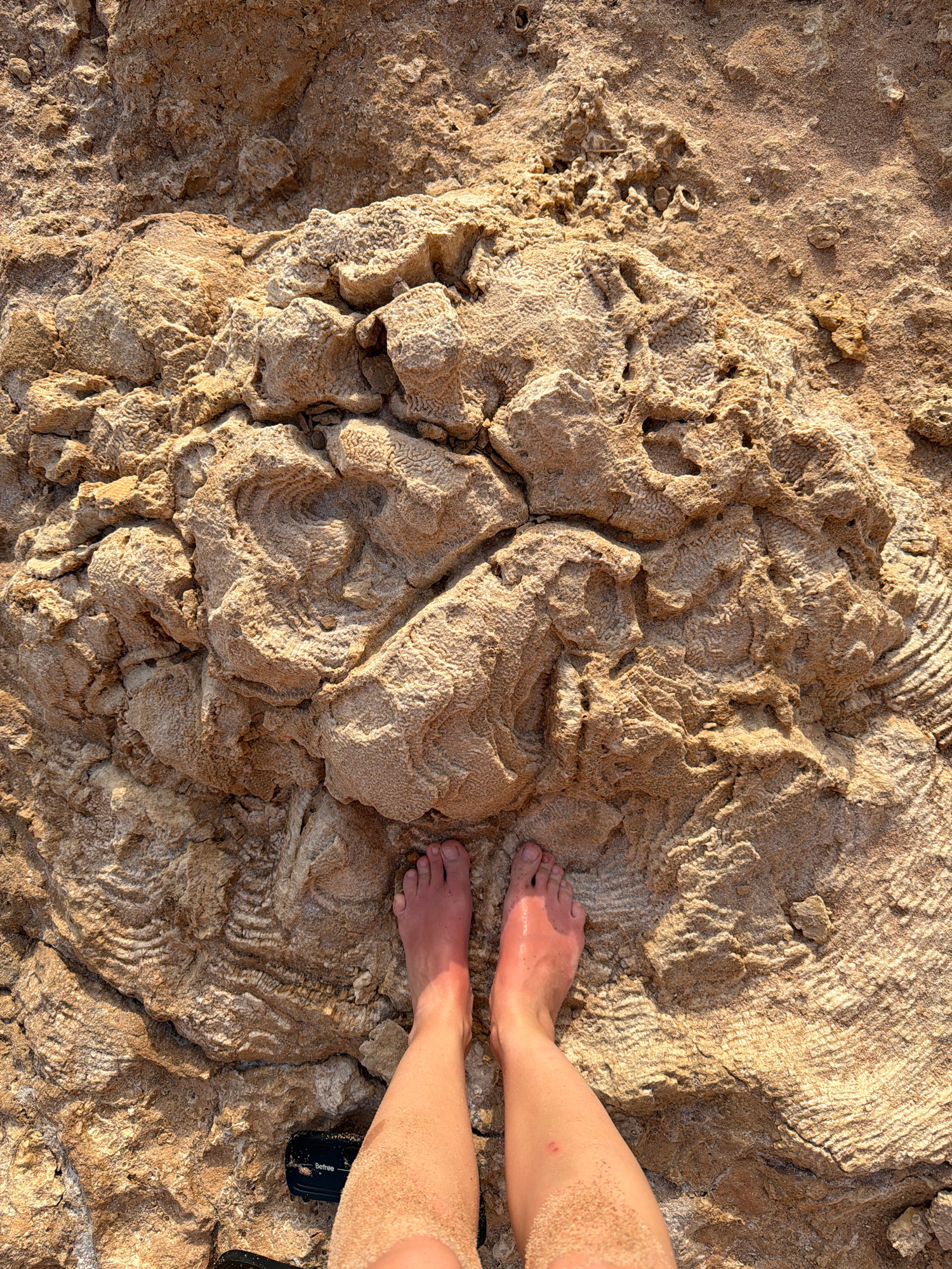 Overhead shot on a sunny day shows a person's feet on a tan, rough stone surface with a small dark object nearby. The stone features varied textures, some coarse and porous, others with intricate, wav…read more