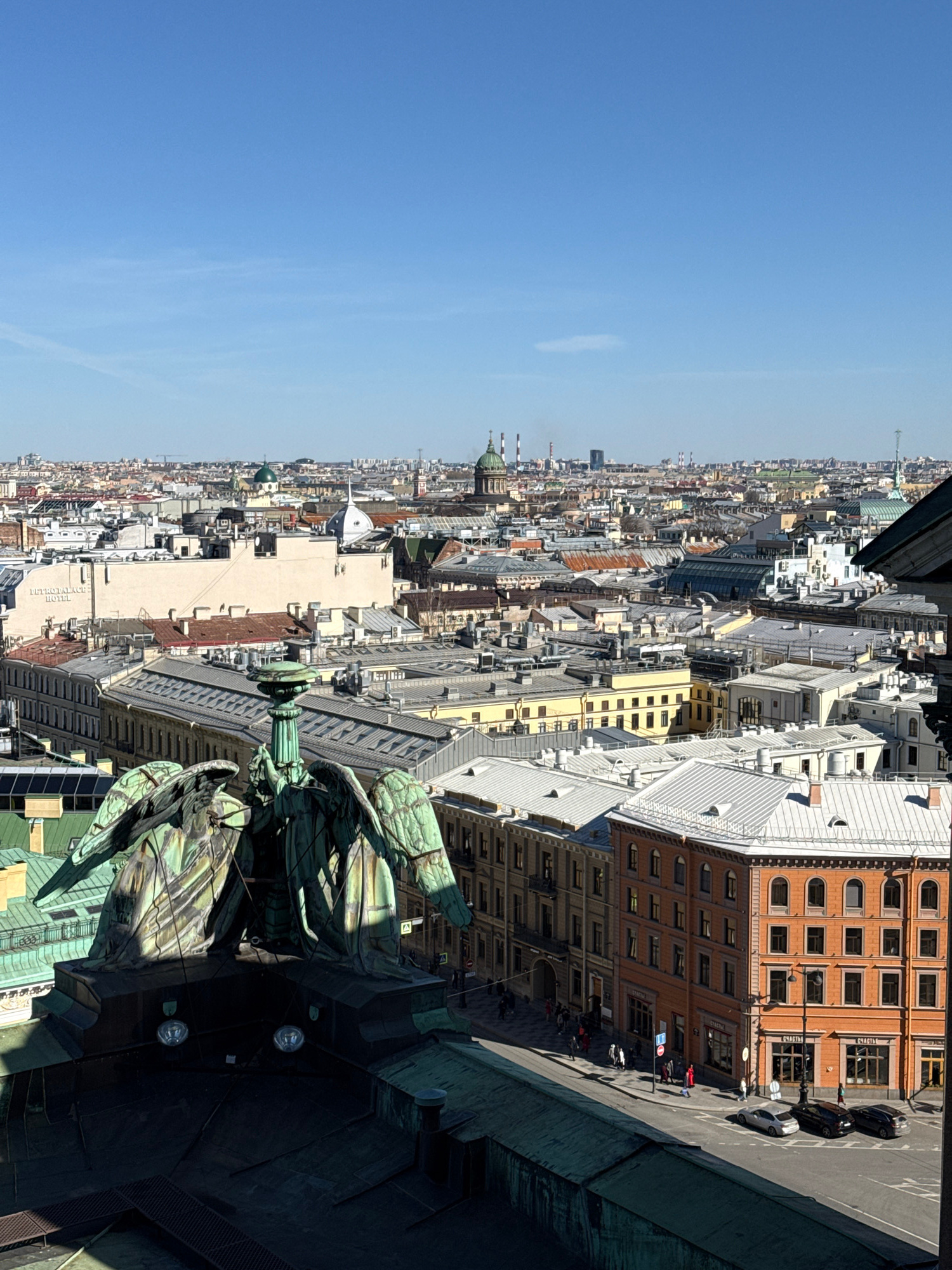 The image is an eye-level view of Saint Petersburg, Russia. The photograph appears to be taken from a high vantage point such as a tall building. The photograph depicts a cityscape with many buildings…read more