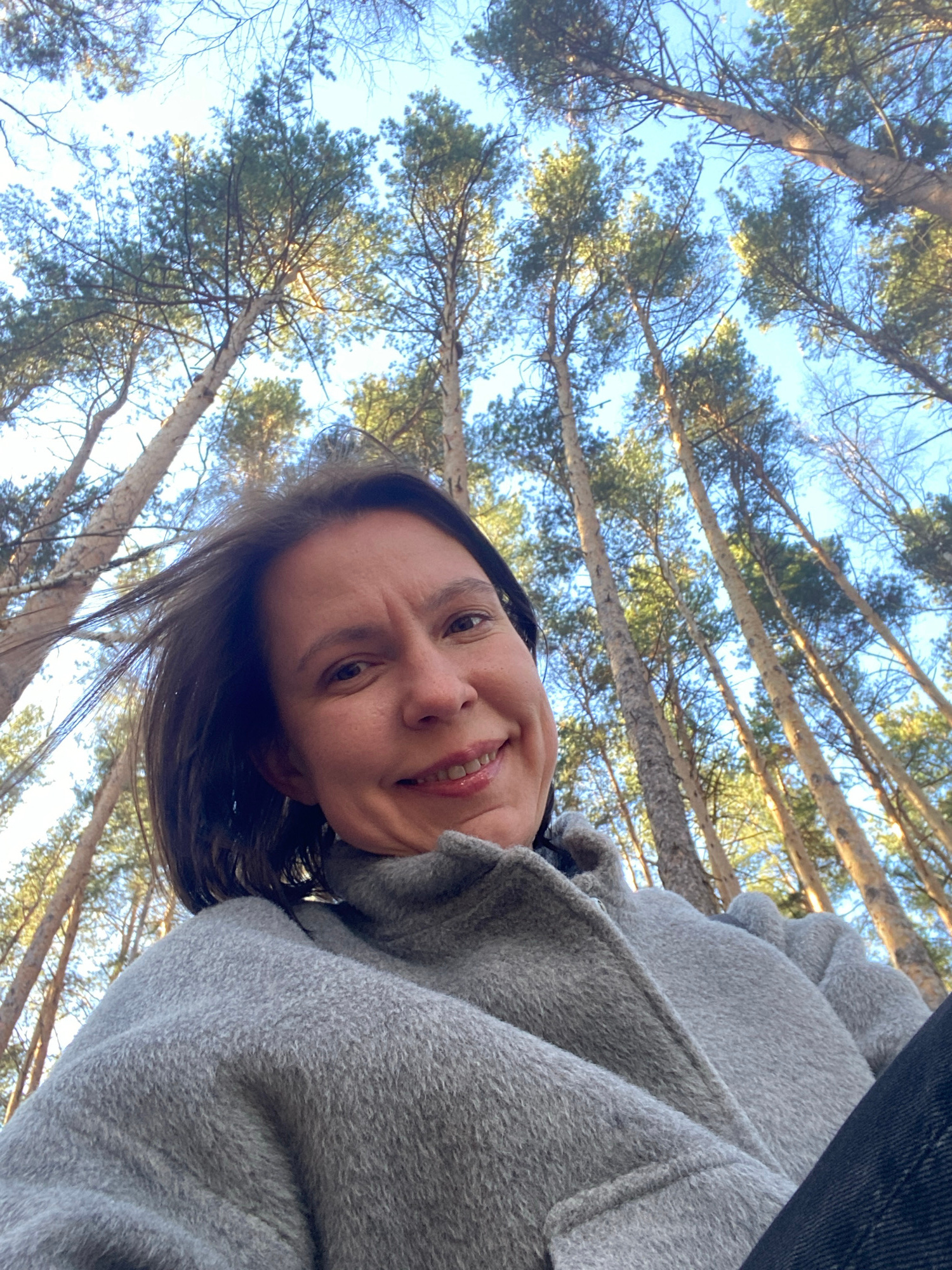 A woman is looking directly into the camera. She is wearing a grey wool coat. The photo is taken from a low angle, looking up into a forest. The trees have thin, bare trunks and green foliage at the t…read more