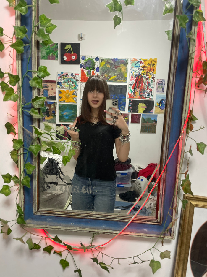 The scene depicts a mirror selfie taken indoors in Raanana, Israel. A young female subject, with shoulder-length dark brown hair and bangs, is reflected in a large, rectangular mirror with a distresse…read more