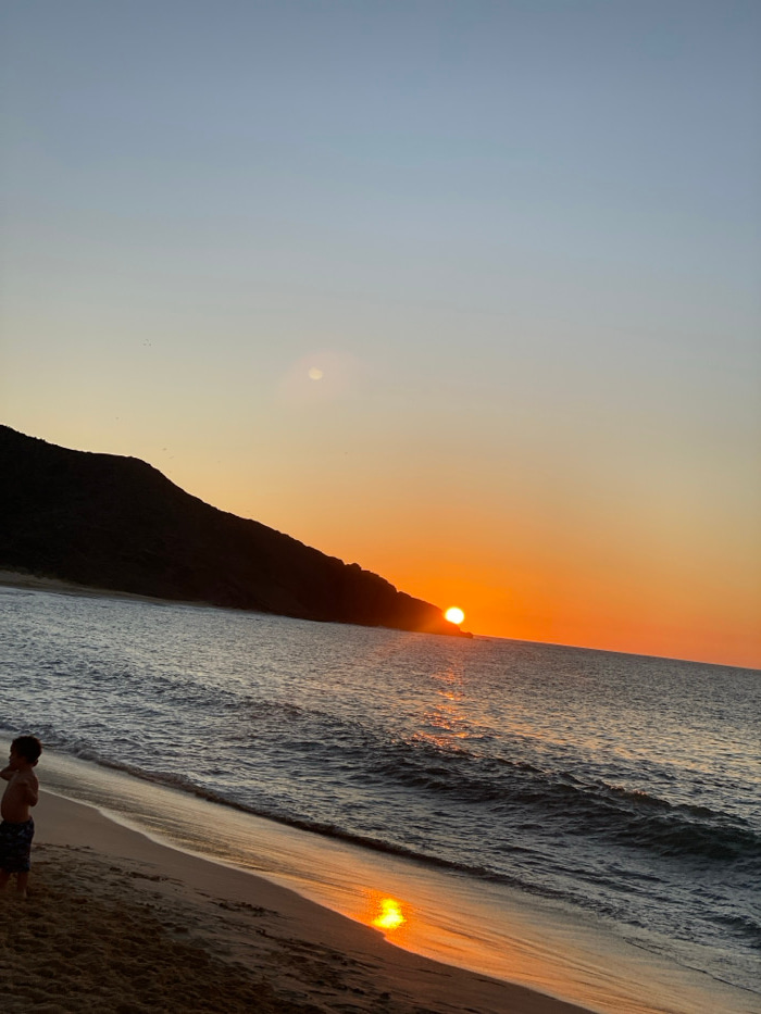 The image depicts a coastal sunset scene in Altagracia, Venezuela. A young child, partially visible on the lower left, stands on the sandy beach facing the ocean, wearing dark patterned swim trunks. T…read more
