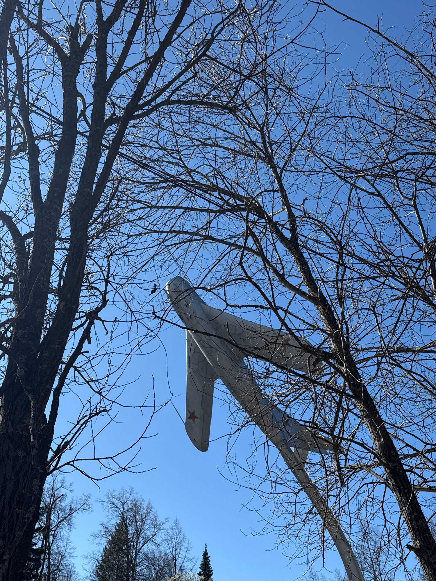 The photograph, taken from a low angle, depicts a gray MiG-15 fighter jet mounted on a pylon, viewed through the bare branches of trees. The jet, marked with a red star, appears to be a monument. The…read more