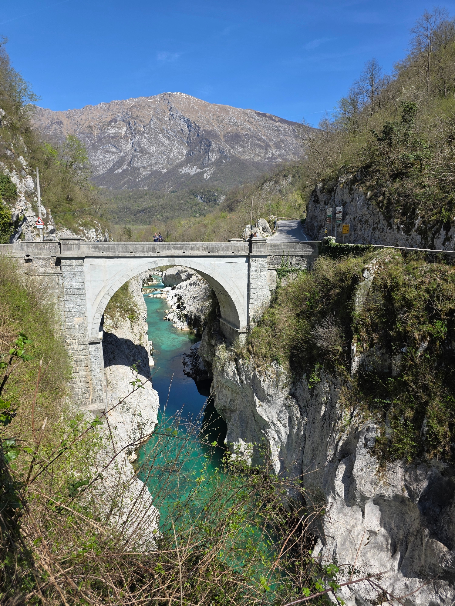 This image depicts a scenic view of the Soča River in Slovenia near the town of Mlinsko. The turquoise river flows under a large, arched concrete bridge. The riverbanks are rocky and covered with vege…read more
