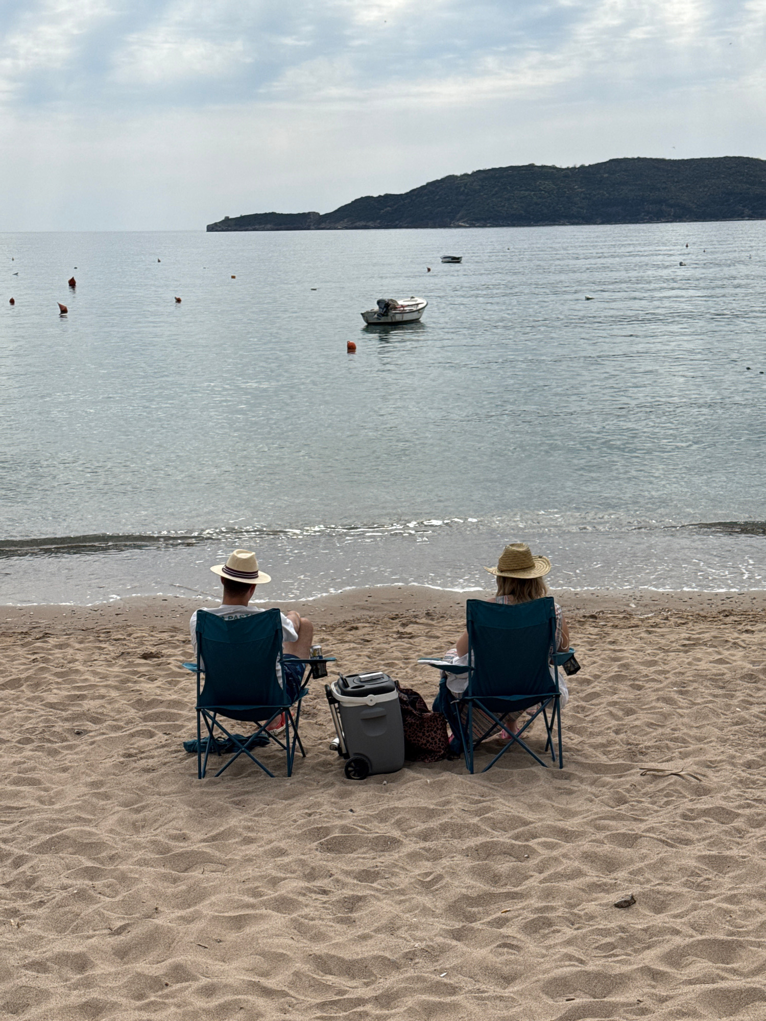 Two individuals sit in folding chairs on a sandy beach next to the water. The water is relatively calm with a few boats and buoys visible in the distance. A large, mountainous landmass dominates the l…read more