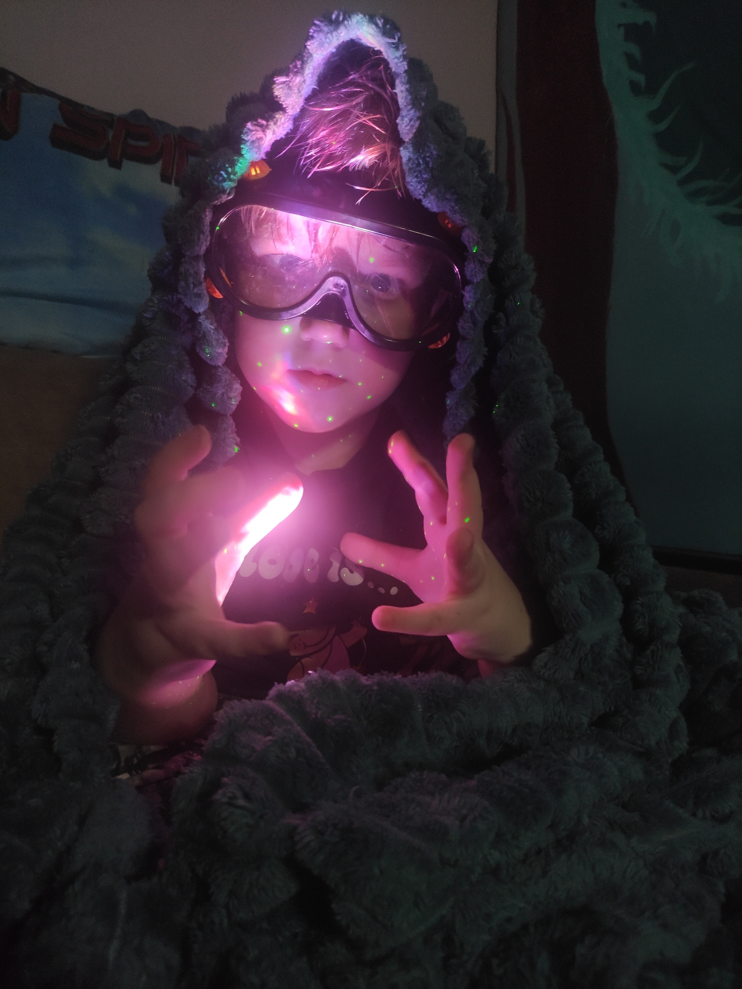 A child wearing goggles is partially enclosed by a dark, plush, tunnel-like structure. The child's face and outstretched hands are illuminated by a bright, pinkish-purple light. The child appears to b…read more