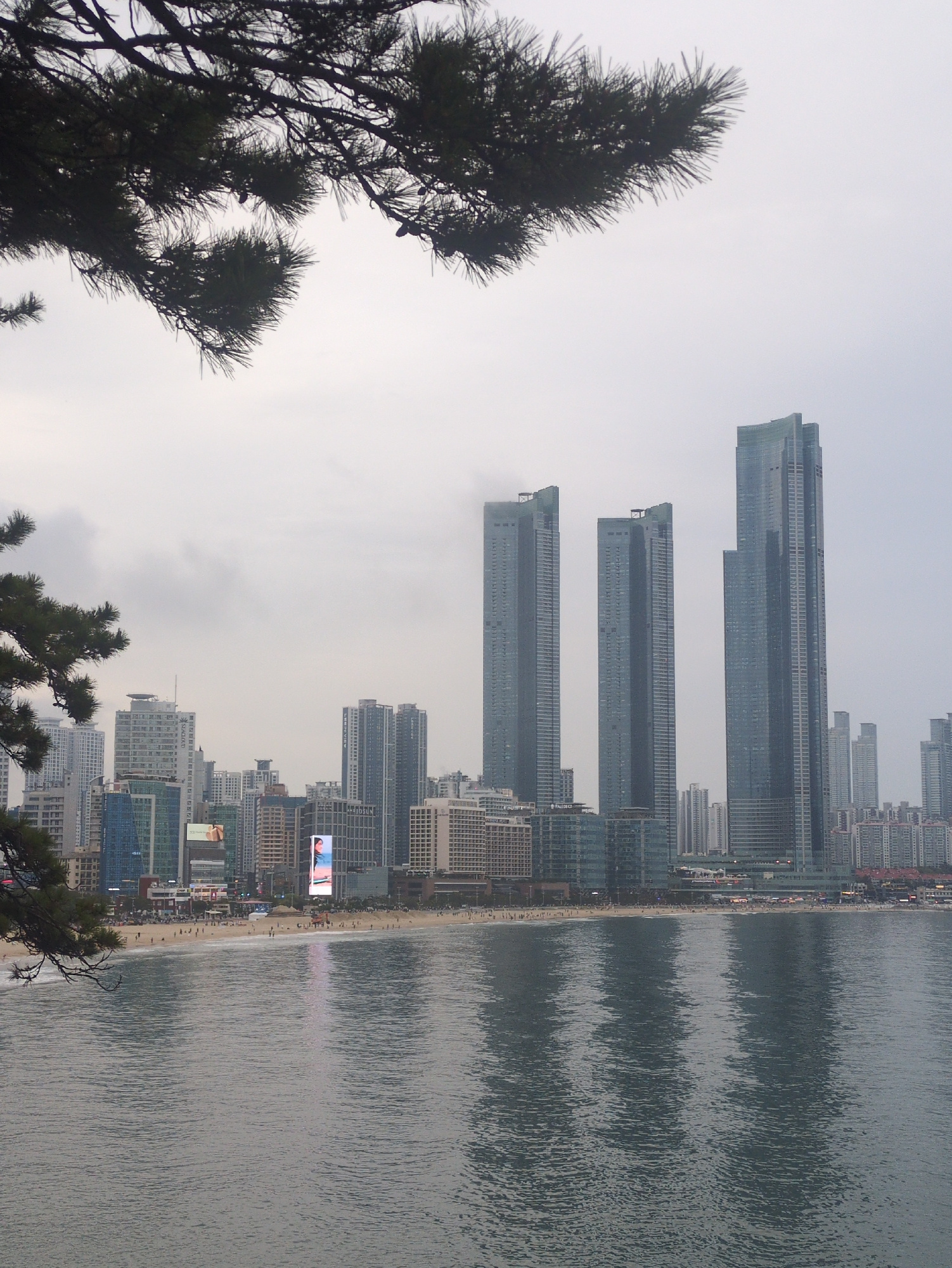 The image is an eye-level outdoor shot looking toward the sea and coastline of Busan, South Korea. Dominating the center of the frame are several high-rise buildings, indicative of the city's modern a…read more