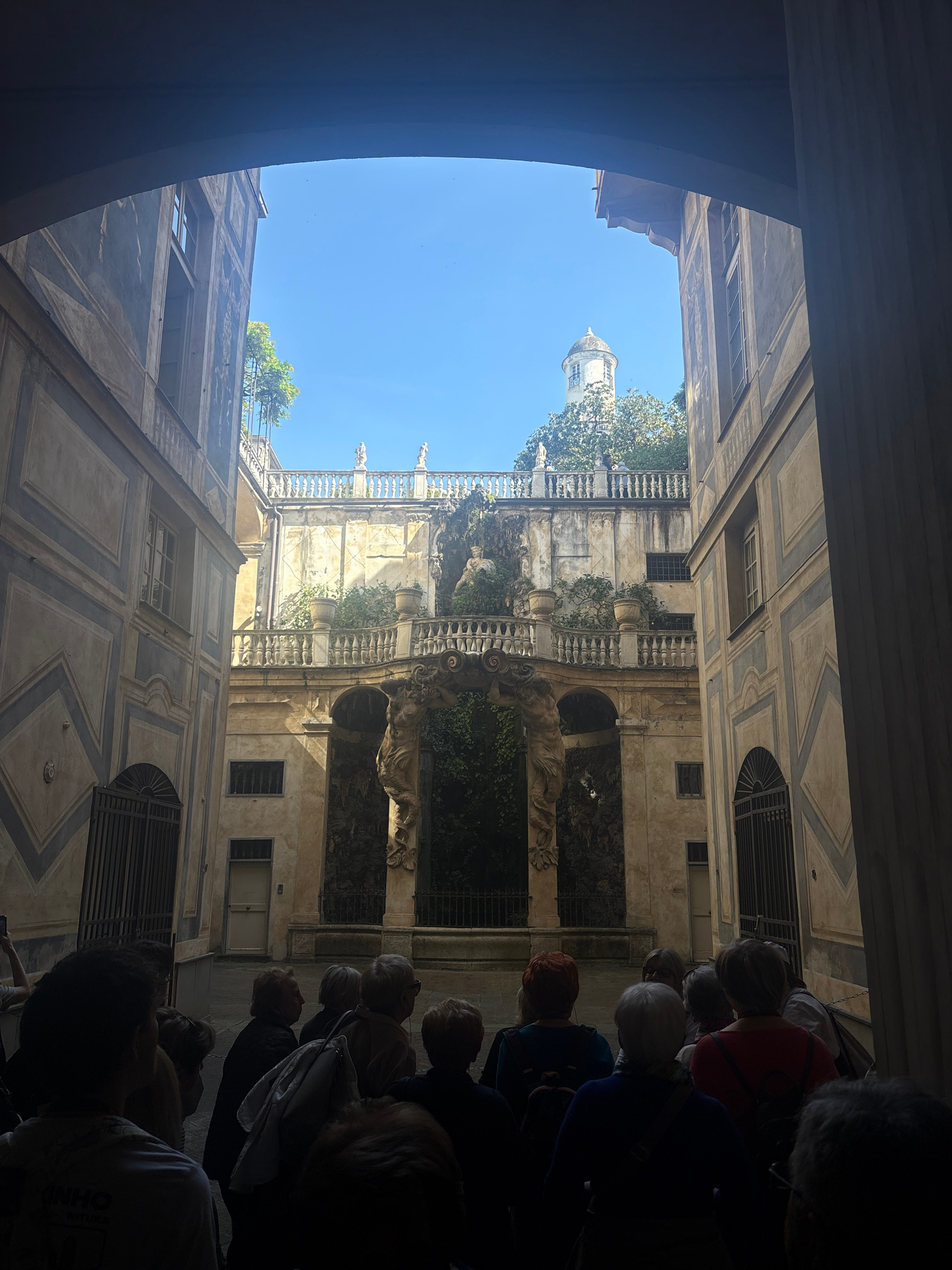 Captured from a low angle and oriented vertically, the image depicts a courtyard scene in Genoa, Italy. The architectural style is baroque. The buildings are adorned with pale walls, embellished with…read more