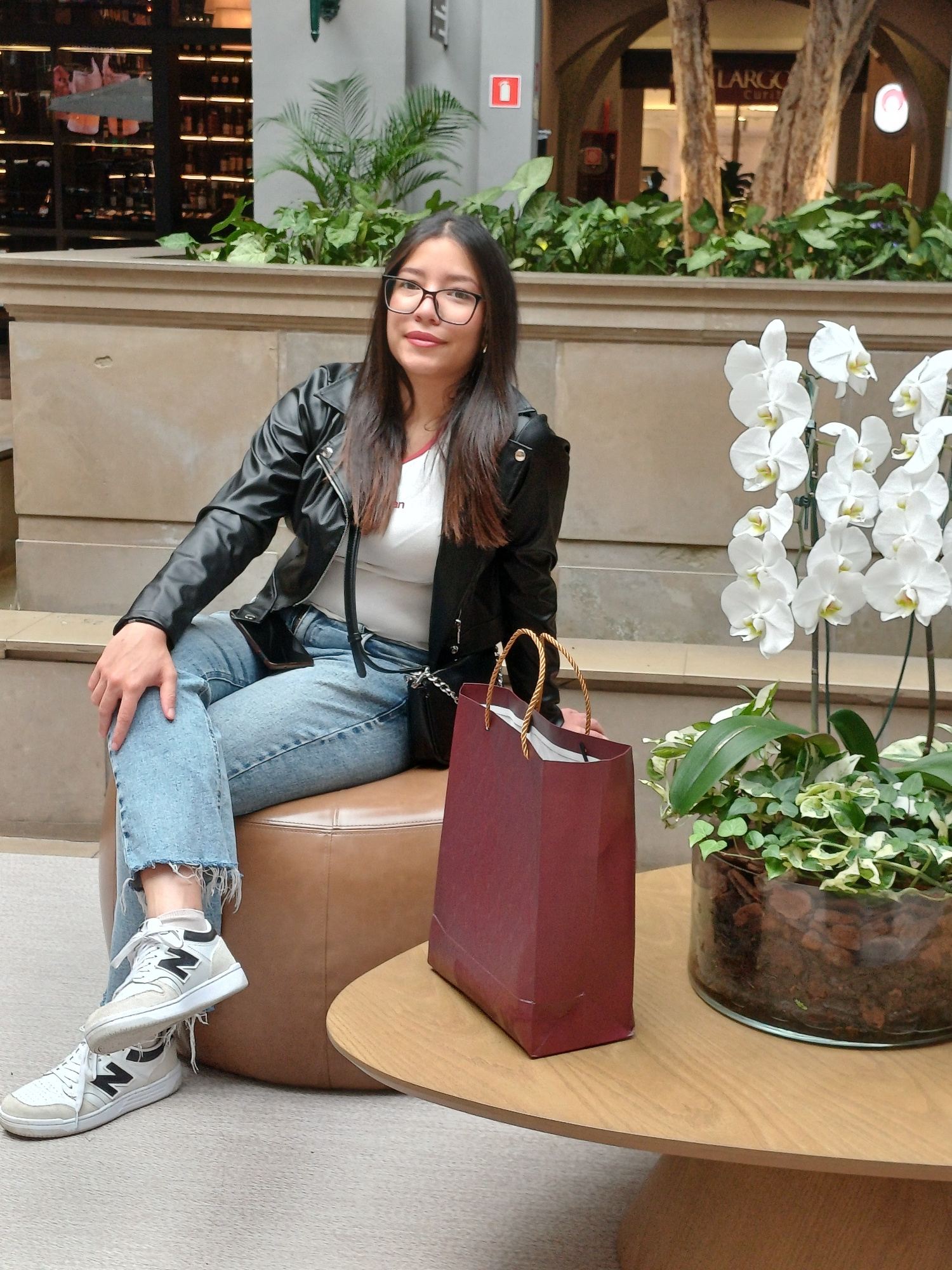 A young woman with long dark hair, wearing glasses, a black leather jacket, a white t-shirt, and light blue jeans, sits on a brown leather ottoman. A burgundy shopping bag rests on a round wooden tabl…read more
