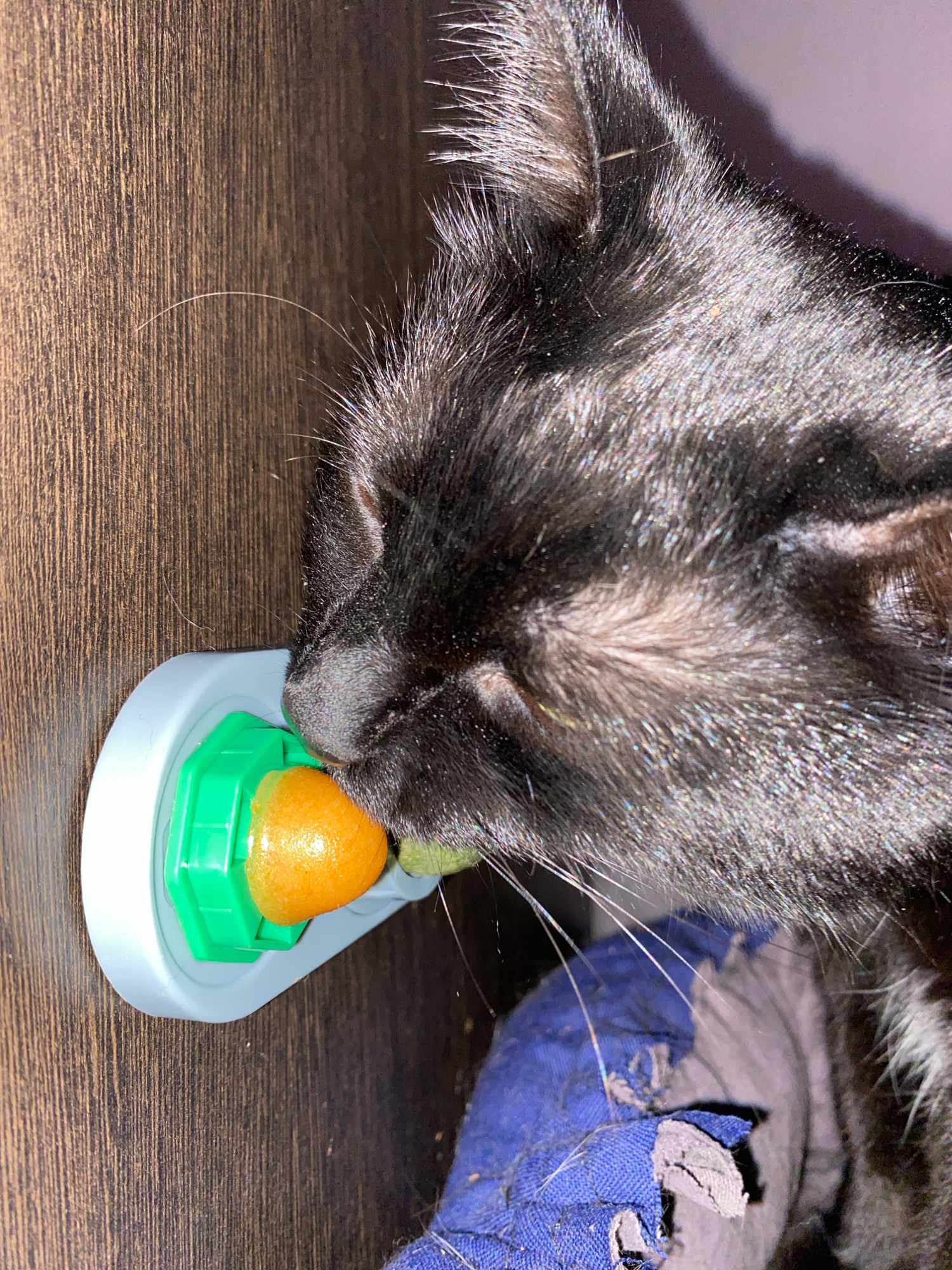 A black cat is eating a treat from a gray and green plastic container on a dark brown wooden surface. Part of a blue object is visible in the background. The location is not discernible.