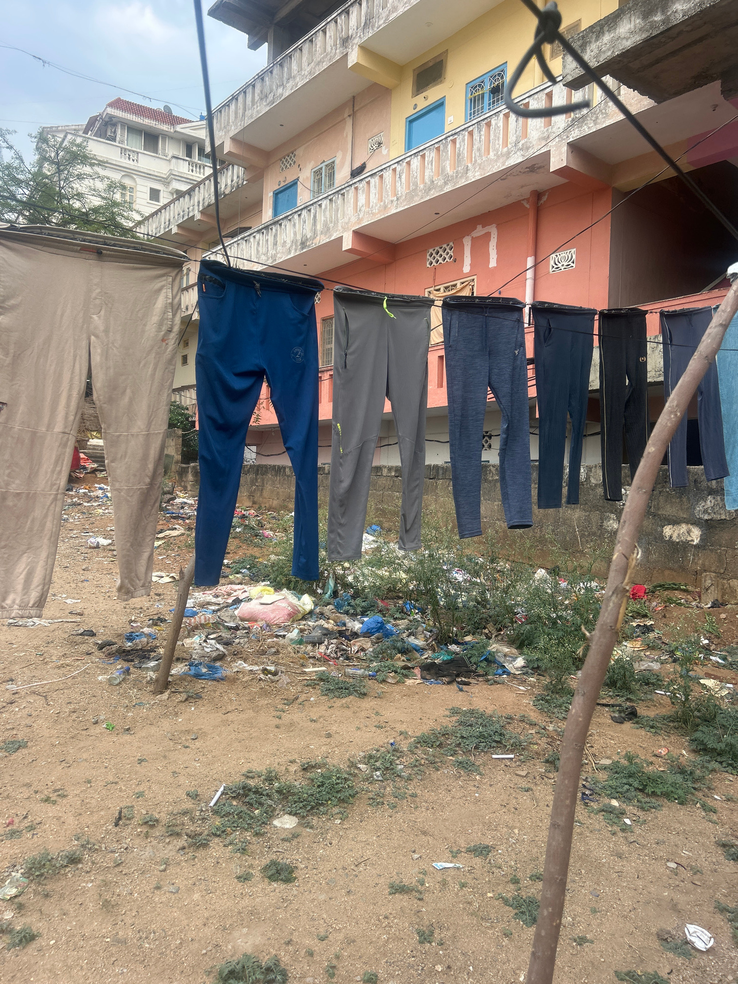 This image depicts a residential area in Puttaparthi, India, characterized by a utilitarian clothesline set against a backdrop of multi-story buildings and ground covered in refuse. Seven pairs of tro…read more