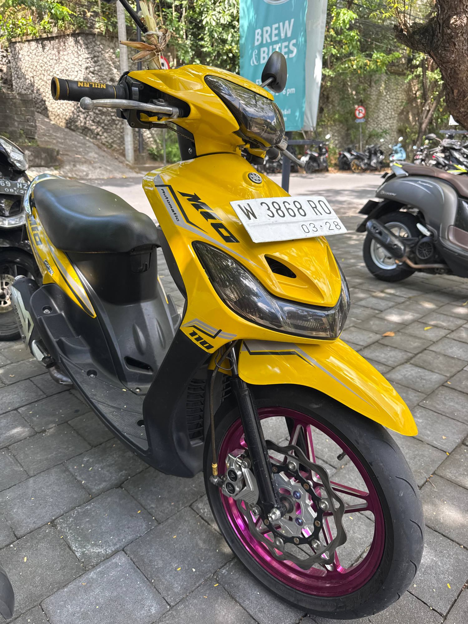 The image shows a yellow Yamaha Mio scooter parked on a brick paved surface. The scooter has a license plate that reads "W 3868 RO" with an expiration date of March 2028. The front wheel features a pu…read more