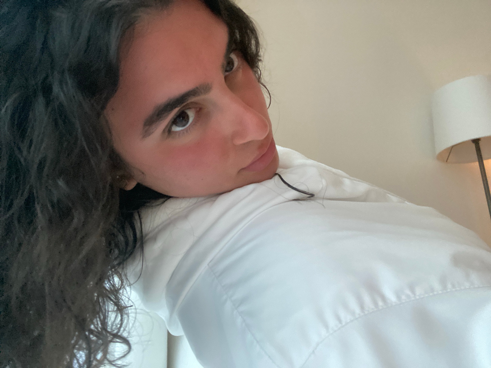 A woman with dark, curly hair is positioned on her side, resting her head against what appears to be a white surface, possibly a pillow or part of a white shirt. Her eyes are directed toward the camer…read more