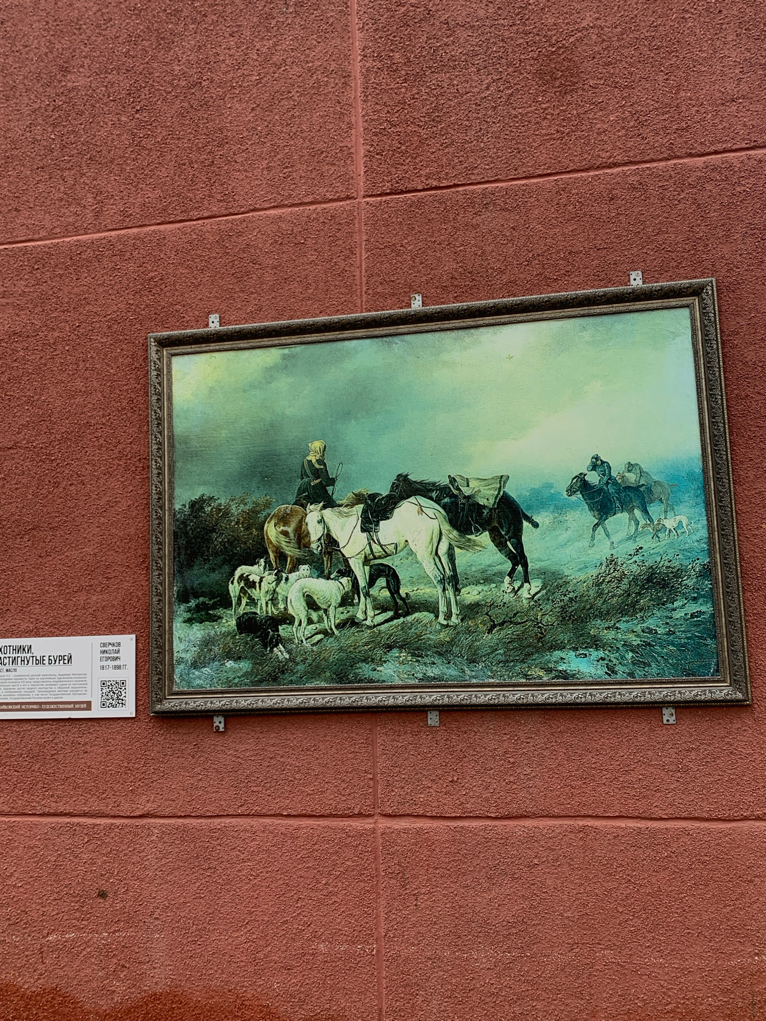 A framed painting hangs on a reddish-brown textured wall. The painting depicts a group of horses and riders in a field. The painting is titled "Huntsmen overtaken by the Storm" by Nikolai Egorovich Sv…read more