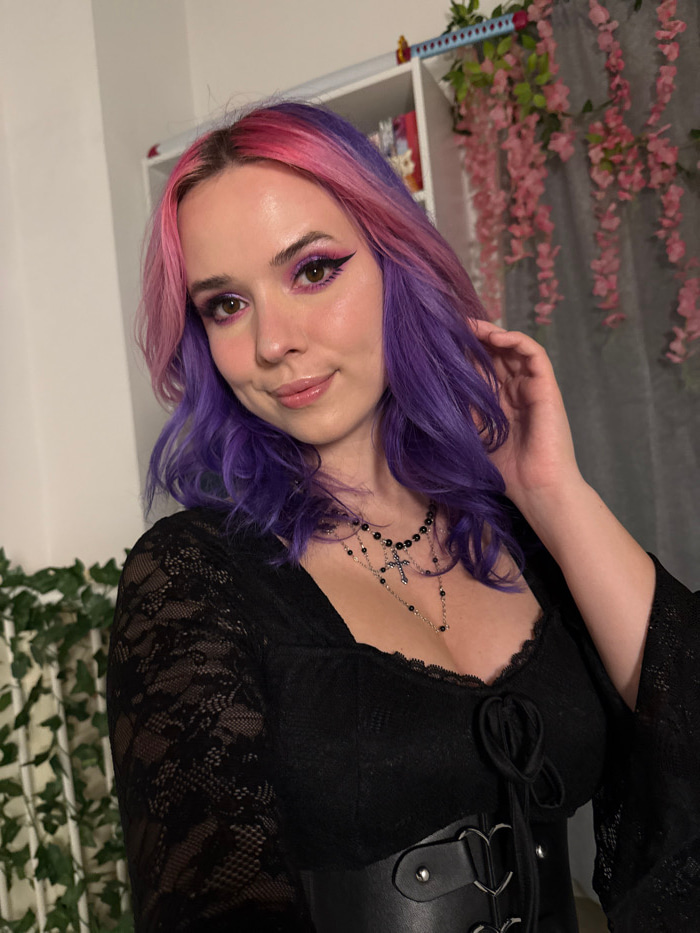 A young adult female, identified as Caucasian, is shown from the chest up in an indoor setting within the City of Zagreb, Croatia. She has wavy, split-dyed hair, transitioning from pink on the right (…read more