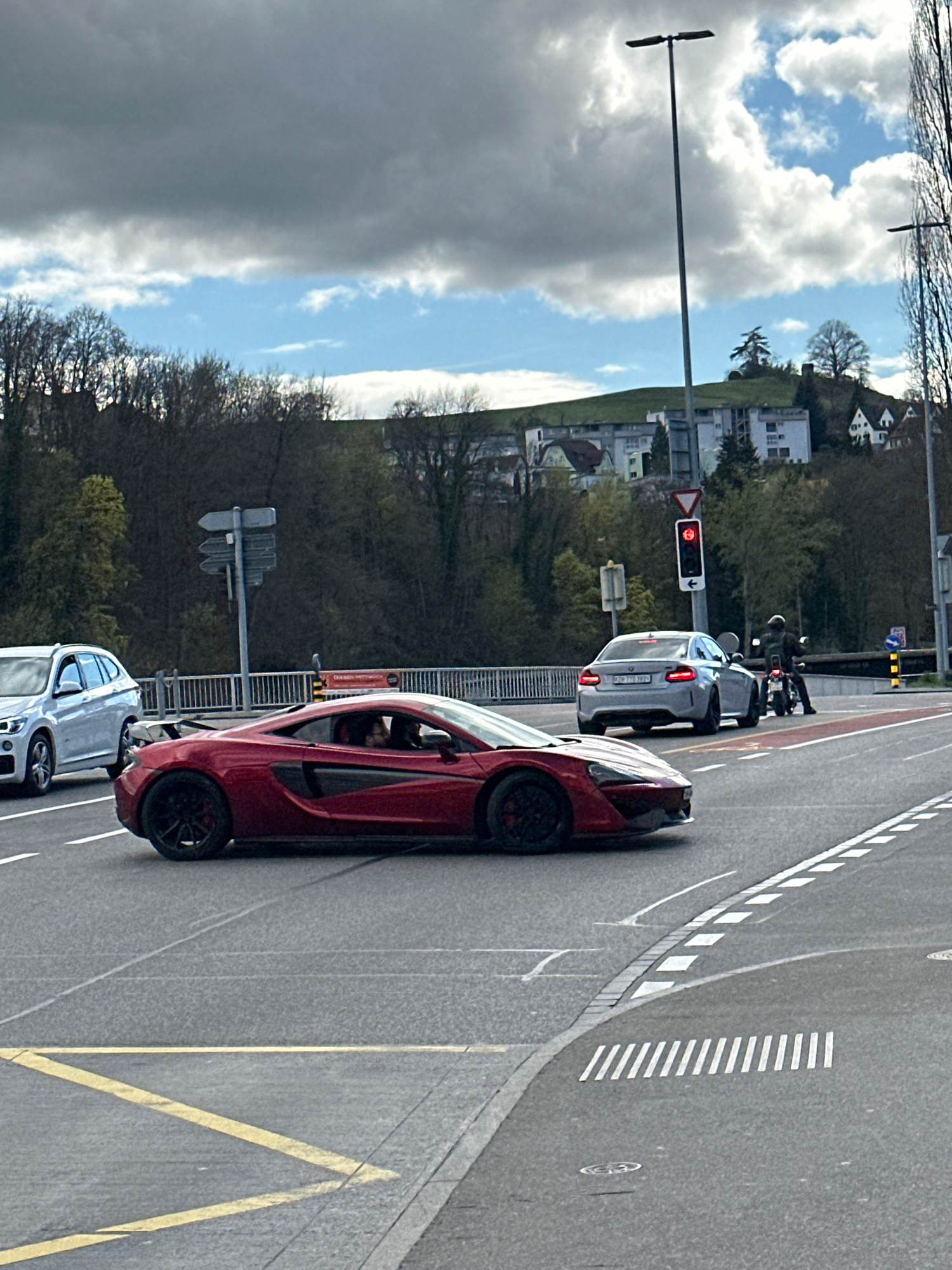The image depicts a street scene in Feuerthalen, Switzerland, showing traffic stopped at a red light. A red sports car is stopped in the lane closest to the camera, followed by a silver car. A motorcy…read more