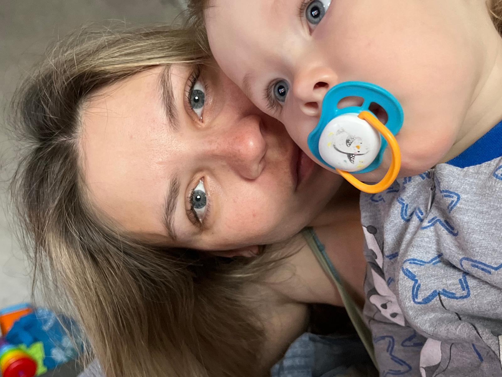 A close-up selfie shows a fair-skinned woman and a baby, presumably in a home setting. The woman has light brown, shoulder-length hair with blonde highlights and blue eyes. The baby is fair-skinned wi…read more