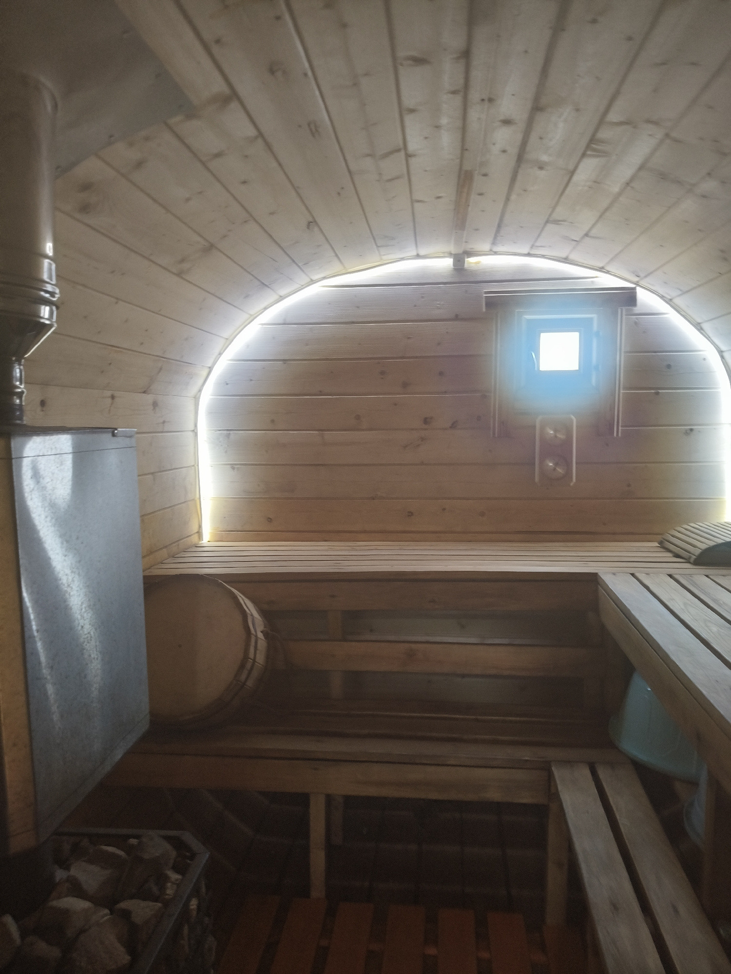 The image depicts the interior of a sauna in Chaikovsky, Russia. The sauna has wooden walls and ceiling with an arched top, and a small window. Inside is a stove with stones, a water bucket, and woode…read more