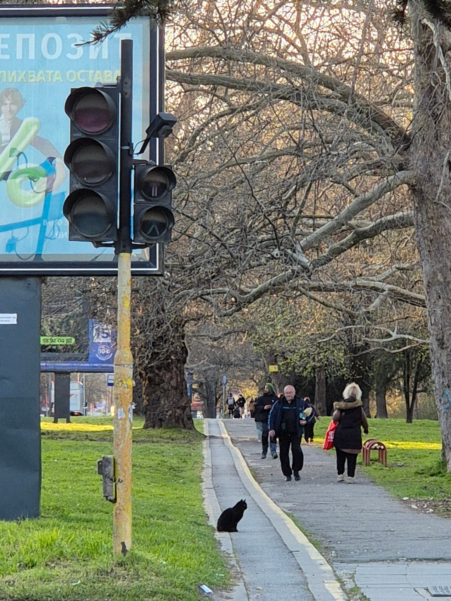 The image depicts an outdoor scene, seemingly in Varna, Bulgaria, based on the Cyrillic script on the billboard. A sidewalk runs along a grassy area, with several people walking along it. These indiv…read more