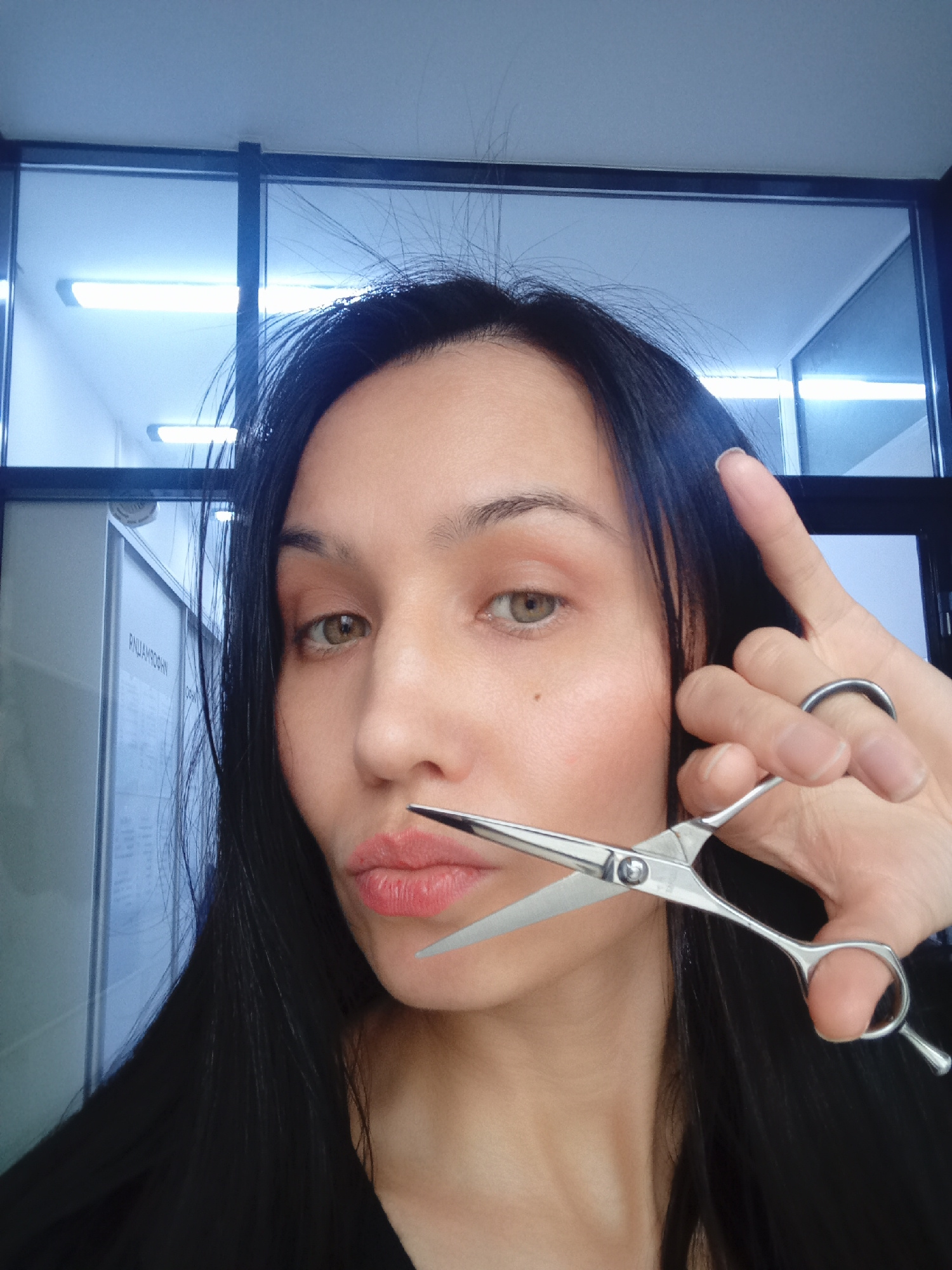 A woman is holding a pair of open scissors near her mouth in a selfie-style photograph. Her hair is long, dark, and straight. She has fair skin, light eyes, and is wearing lipstick. The background app…read more