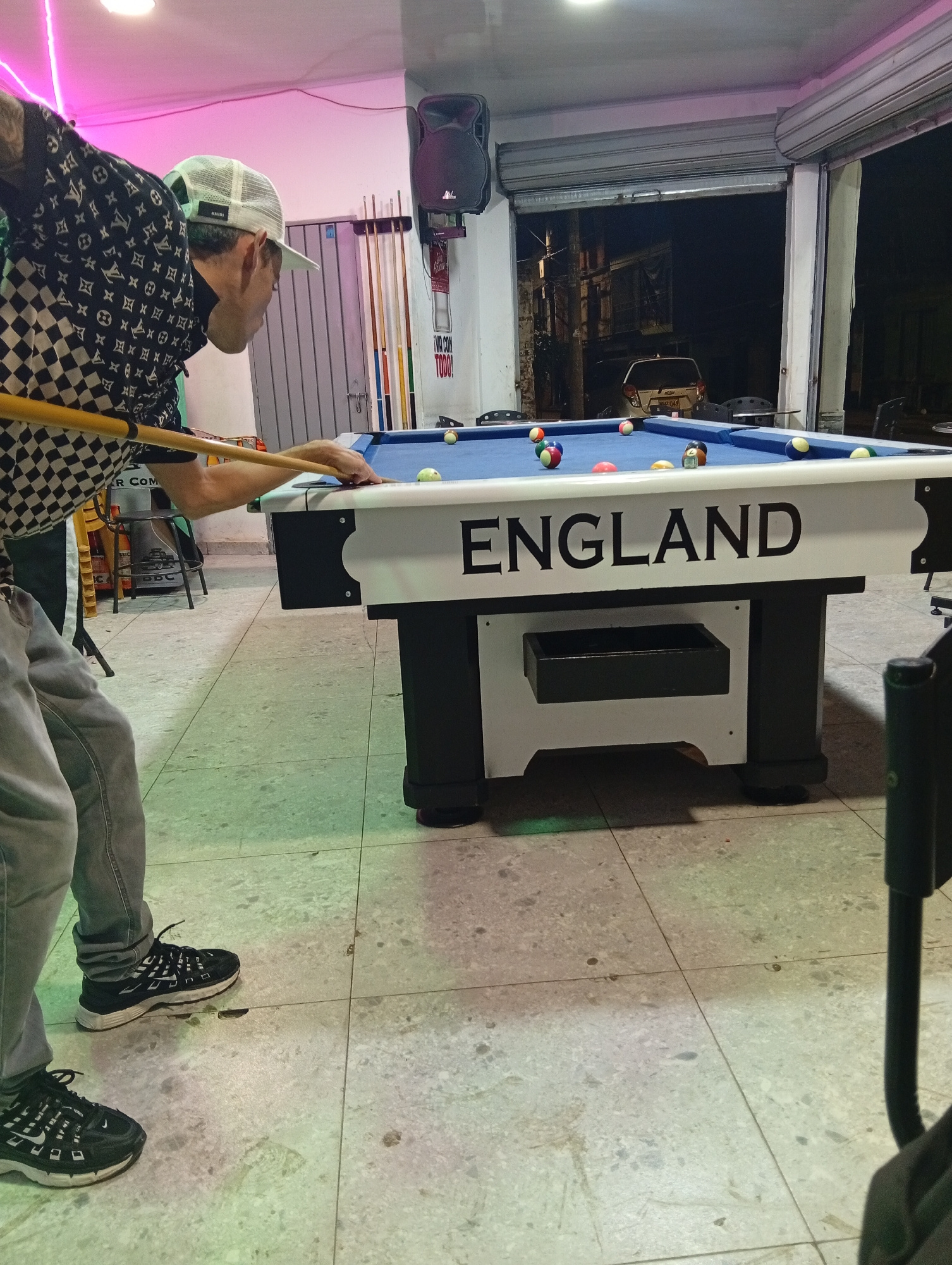 In Jamundí, Colombia, a man with a backwards white baseball cap and a black and white checkered shirt is playing pool at an indoor establishment. The pool table, with the word "ENGLAND" printed on its…read more