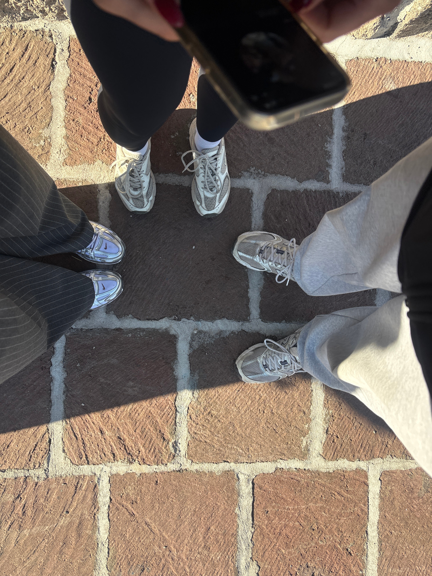 Four individuals are depicted from an overhead perspective, with only their lower legs and feet visible as they stand on a paved outdoor surface. All four are wearing athletic sneakers, primarily in s…read more