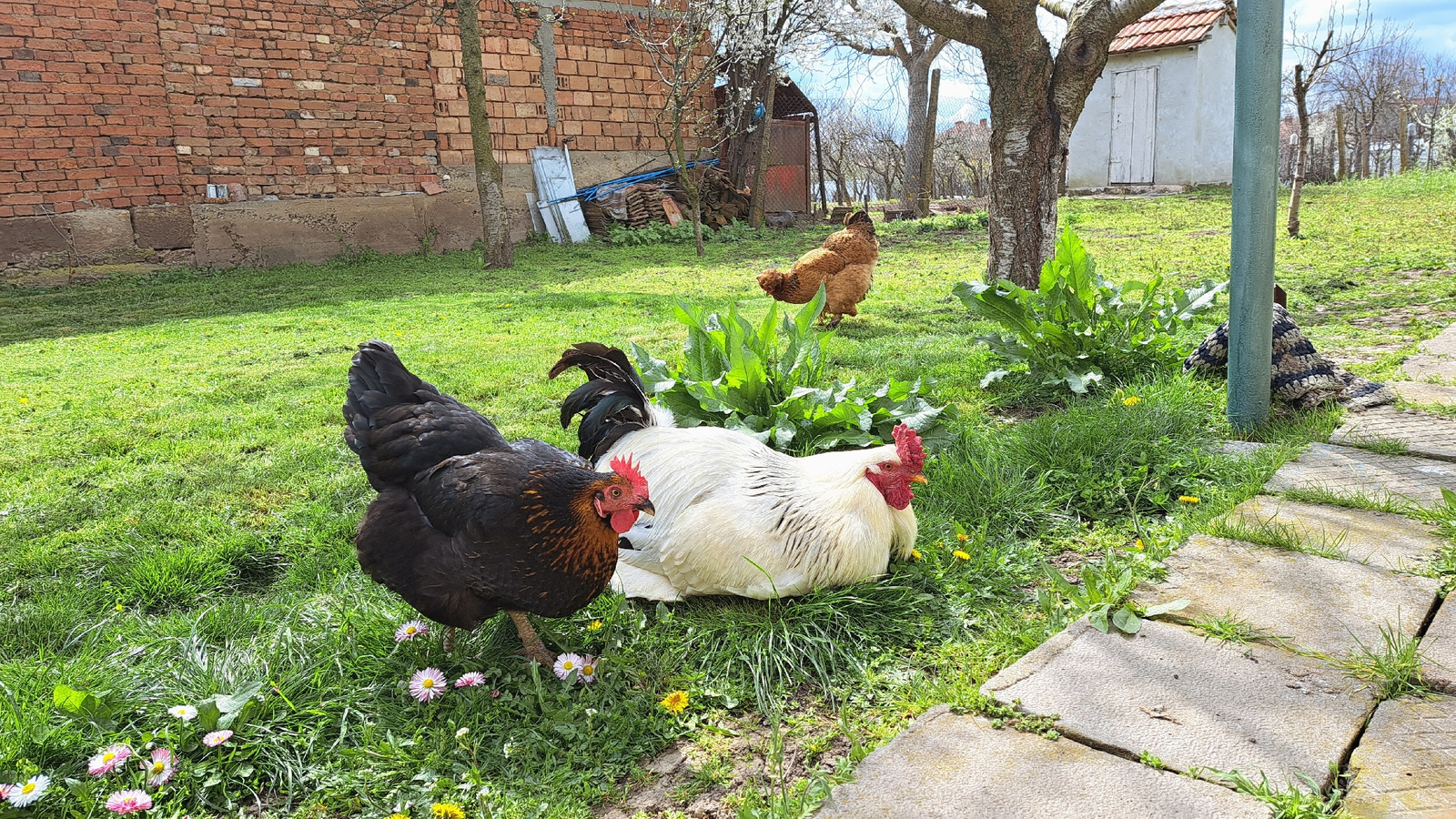 The image depicts a sunny outdoor scene in what appears to be a backyard or rural setting. A black hen stands near a white rooster, which is resting on the grass. Behind them, another reddish-brown ch…read more