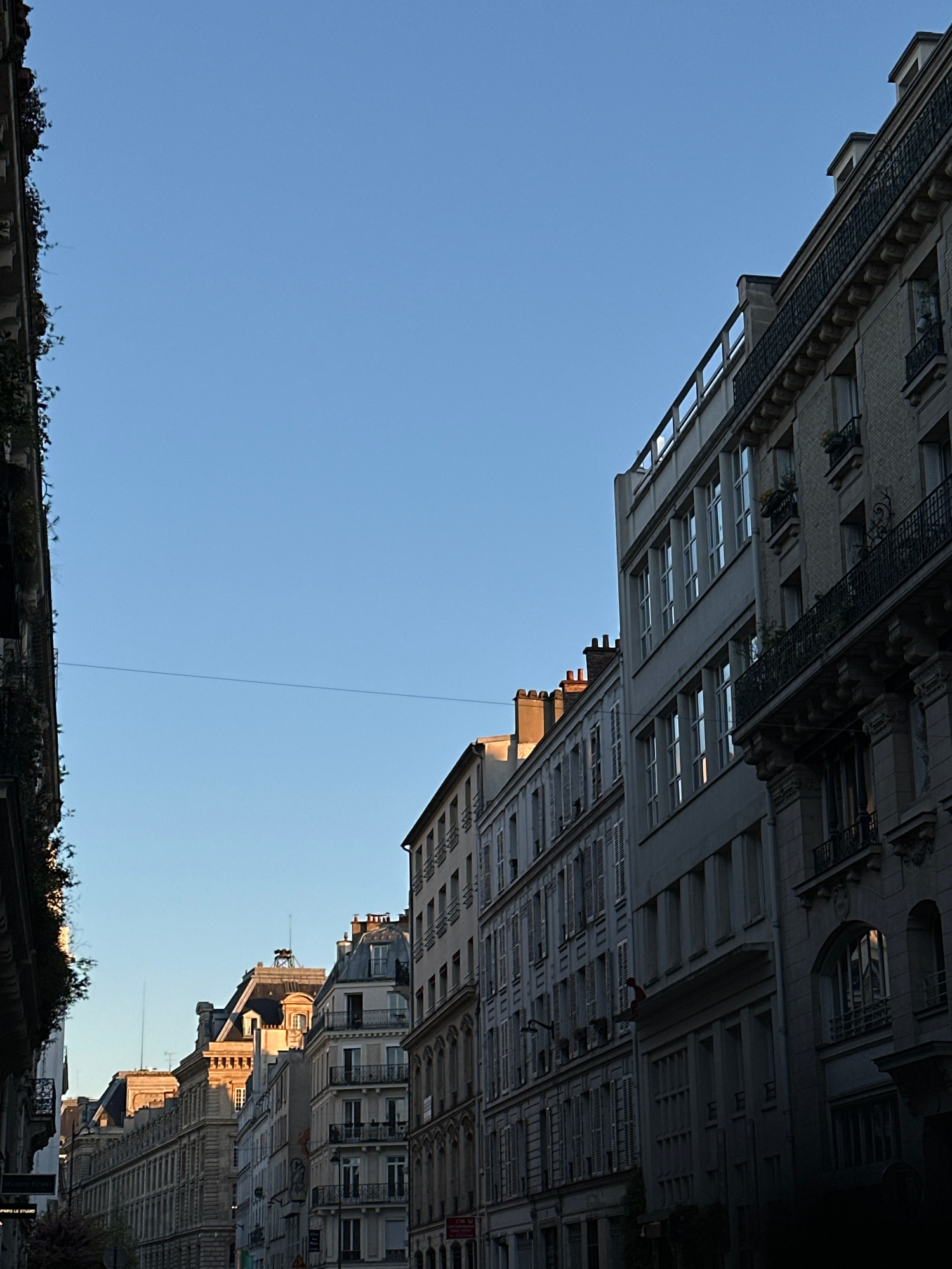 The image shows a street in Paris, France, with tall buildings lining both sides. The buildings have intricate architectural details, including rows of windows, balconies, and ornate facades. The sky…read more