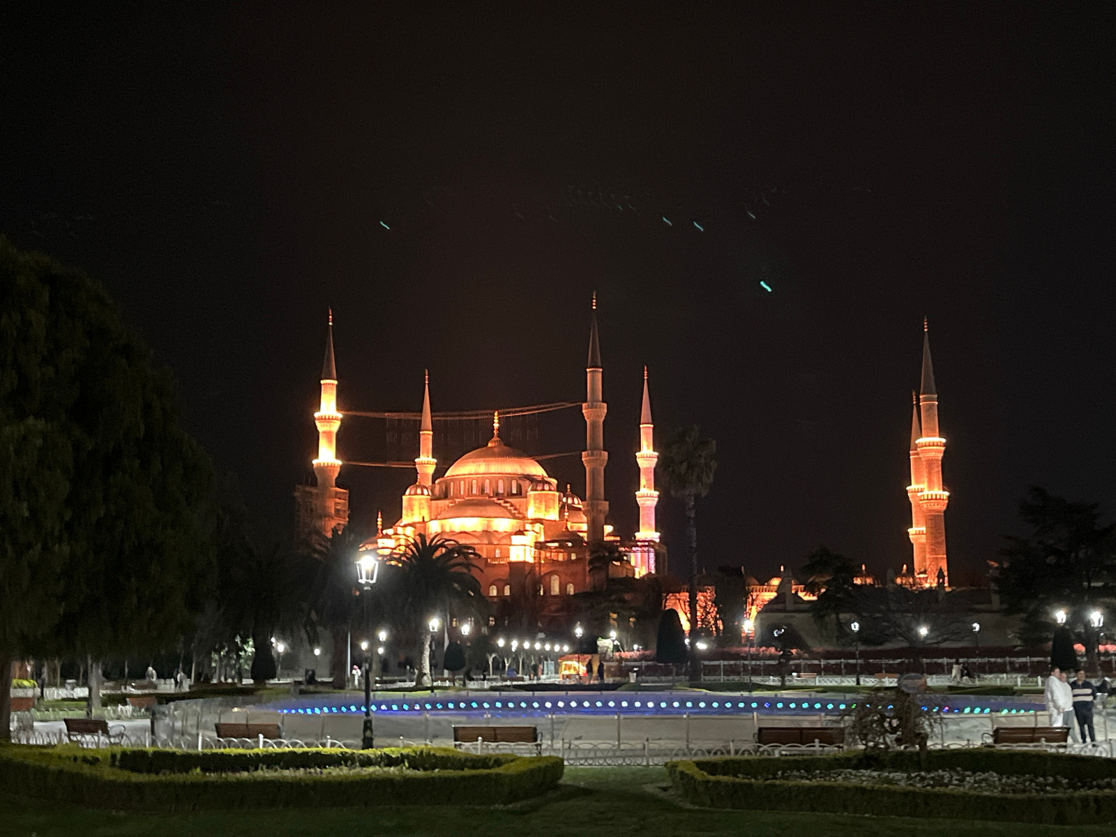 The Blue Mosque in Istanbul, Turkey, is illuminated at night. The mosque features a large central dome and six minarets. In front of the mosque is a public park with benches, manicured hedges, and a s…read more