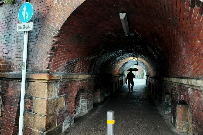 The image depicts a brick-lined arched tunnel, characteristic of the Lake Biwa Canal's aqueduct area near Nanzen-ji Temple in Kyoto, Japan. The tunnel's interior features reddish-brown brickwork in a…read more