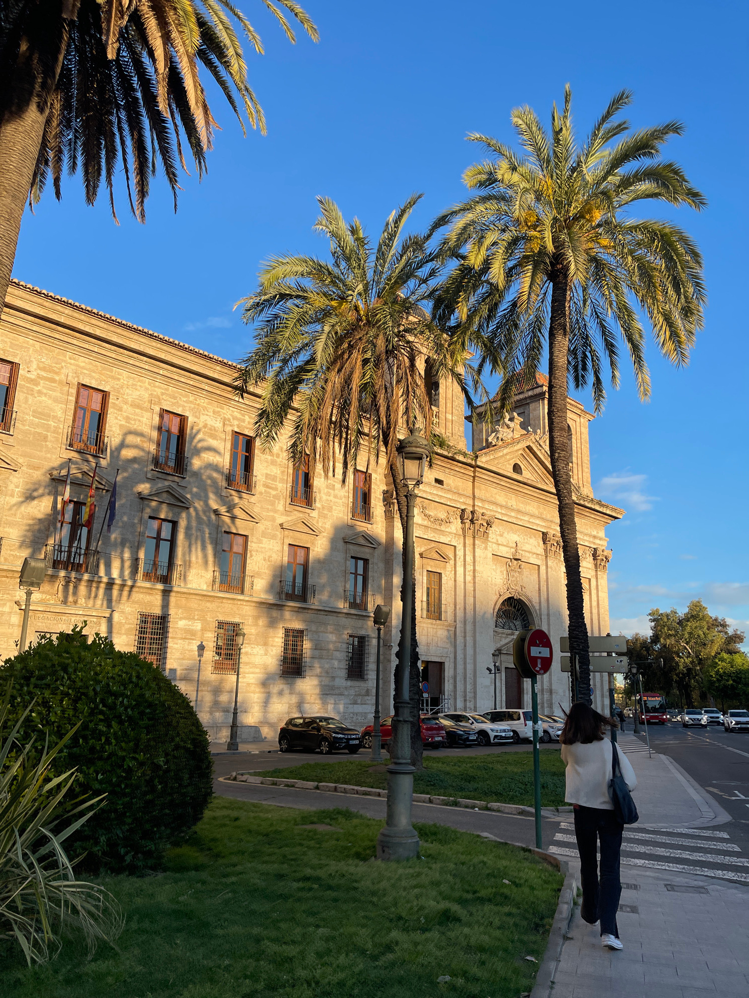 The image shows a street scene in València, Spain. The prominent building is the Delegación del Gobierno, a government building with a light-colored stone facade, visible windows, and architectural de…read more
