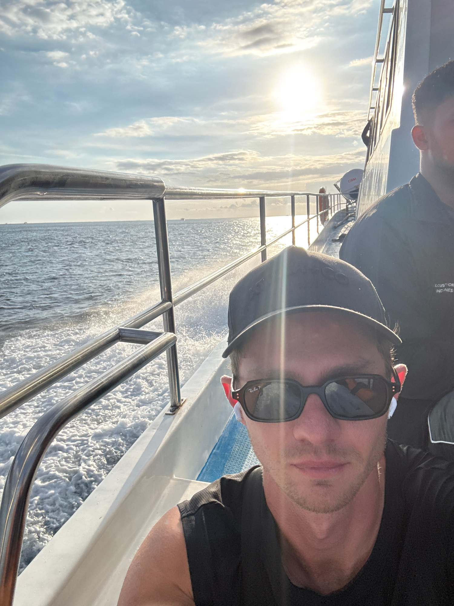 A portrait-oriented photo captures a man taking a selfie on a moving boat under a bright, low-lying sun. The man, in the foreground, wears a dark baseball cap with a faint logo (possibly "GQ") and dar…read more