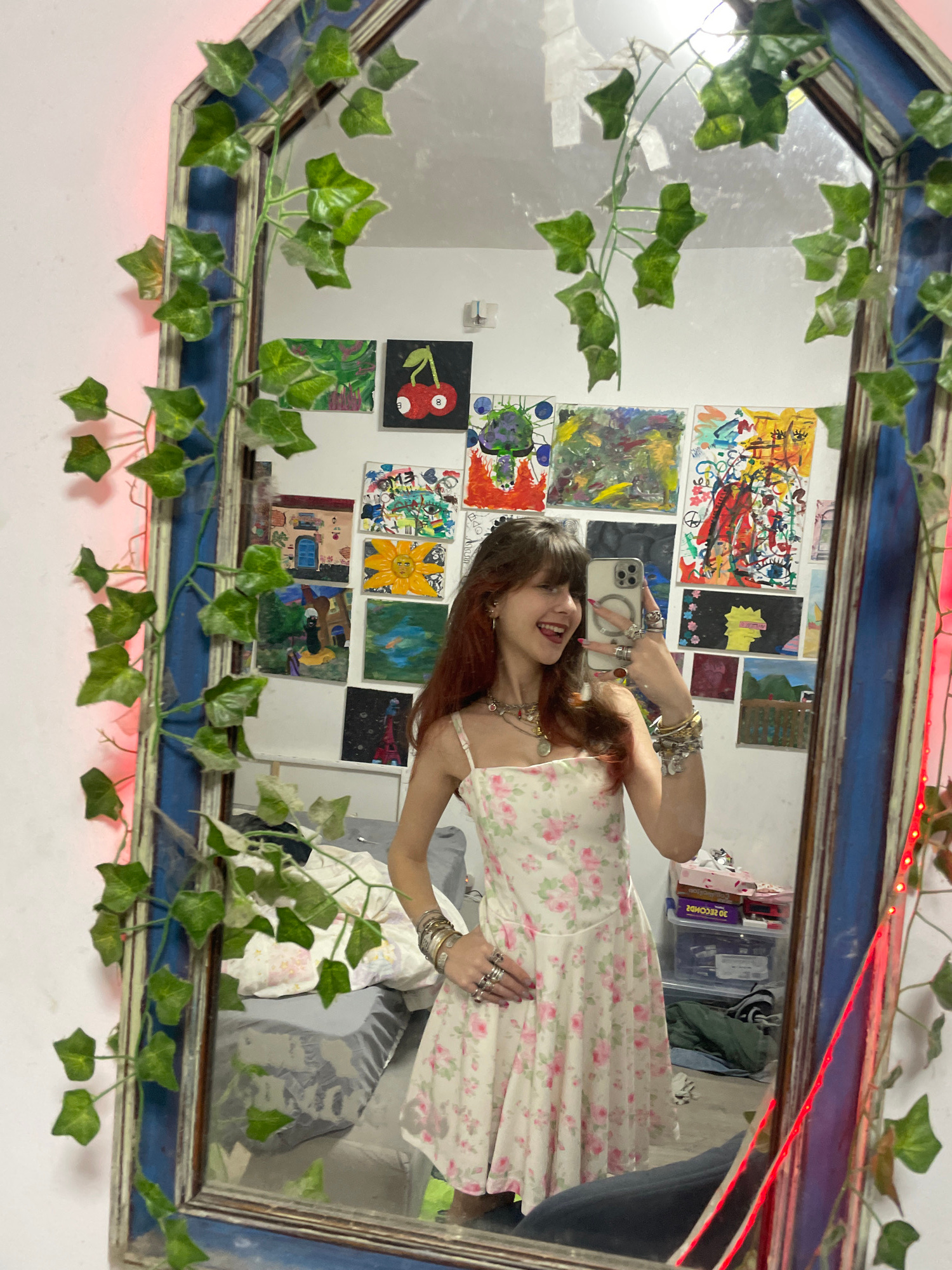 The image shows a young woman taking a selfie in a mirror, which is decorated with artificial ivy and red LED lights. The mirror reflects a room with multiple small paintings or drawings on the wall b…read more
