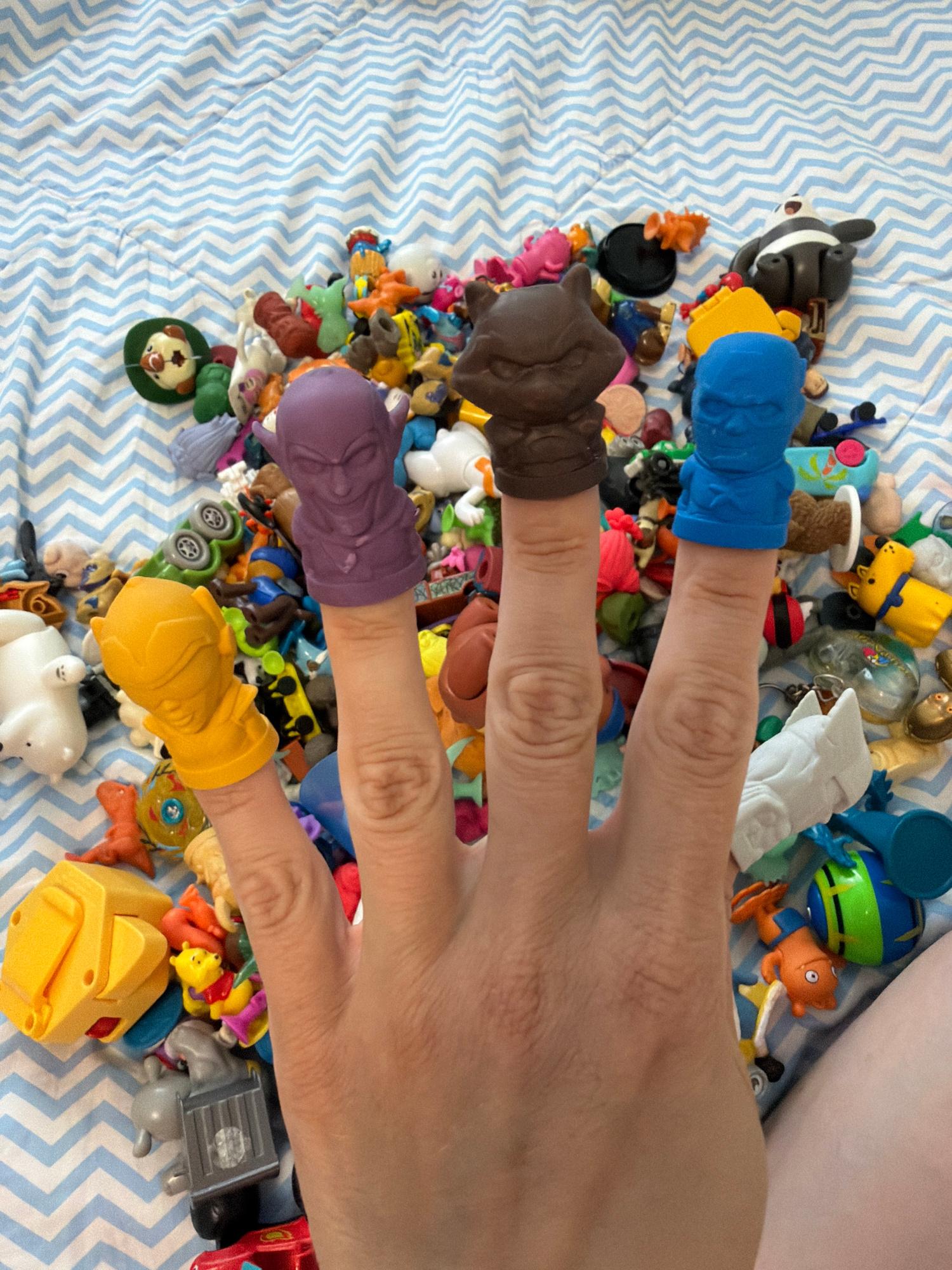 A person's hand rests on a pile of small toys scattered on a blue and white chevron-patterned surface, likely a bedspread or blanket. Each finger, excluding the thumb, is adorned with a finger puppet:…read more