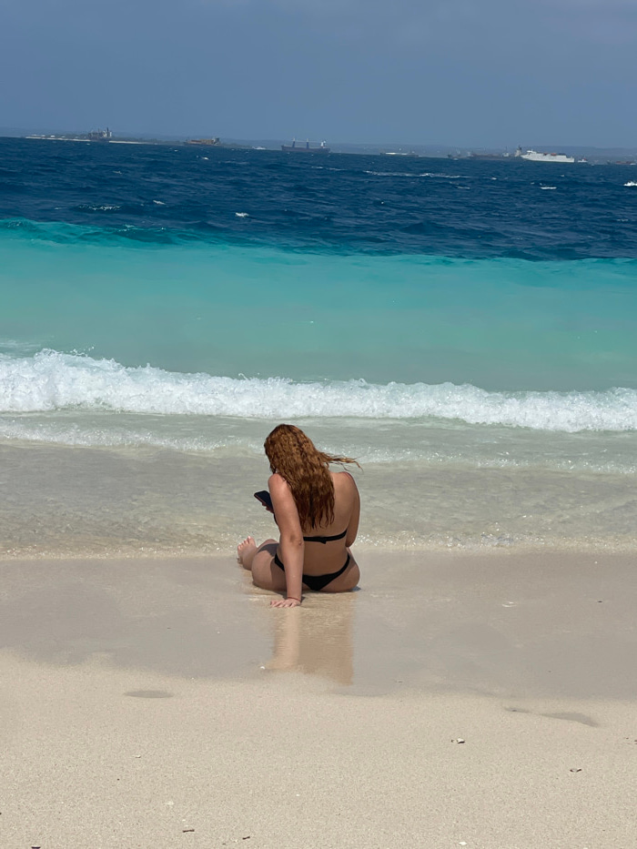 An overhead-angle image depicts a single individual seated on a sandy beach in Zanzibar City, Tanzania, facing the ocean. The subject, a female with long, wavy, reddish-brown hair, is seen from behind…read more